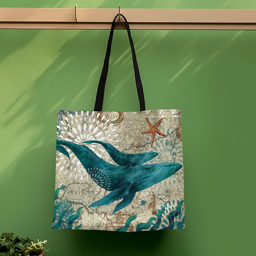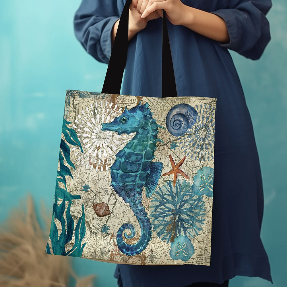 1 pc turtle octopus seahorse whale pattern map vintage, shoulder bag, lightweight full storage bag, multifunctional shopping