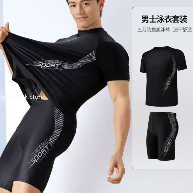 Men Swimsuit O-Neck Short Sleeve Mid-rise Swimming Suit Printing Slim Fit T-shirt Swimming Trucks Set Beachwear