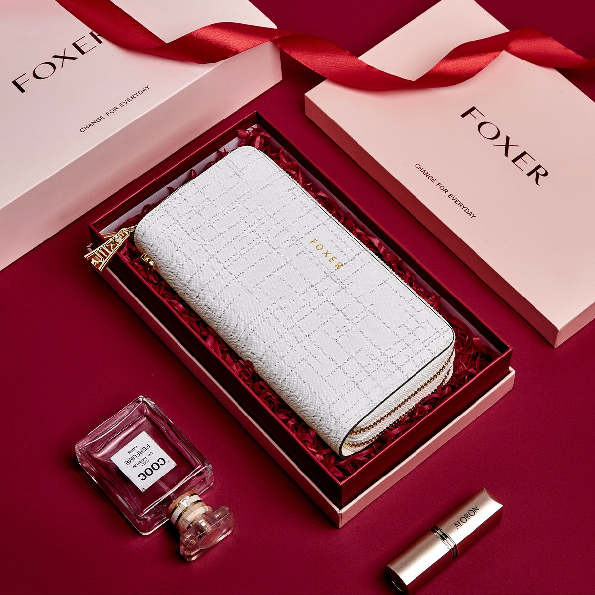 FOXER Split Leather Lady's Wallet Bifold Long Clutch Bag with Wristlet Fashion Card Holder Coin Purse Cellphone Money Bag