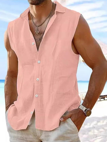 Casual Sleeveless Cotton Linen Shirts Men Vintage Turn-down Collar Buttoned Vest Shirt Summer Mens Fashion Solid Color Vest Tops