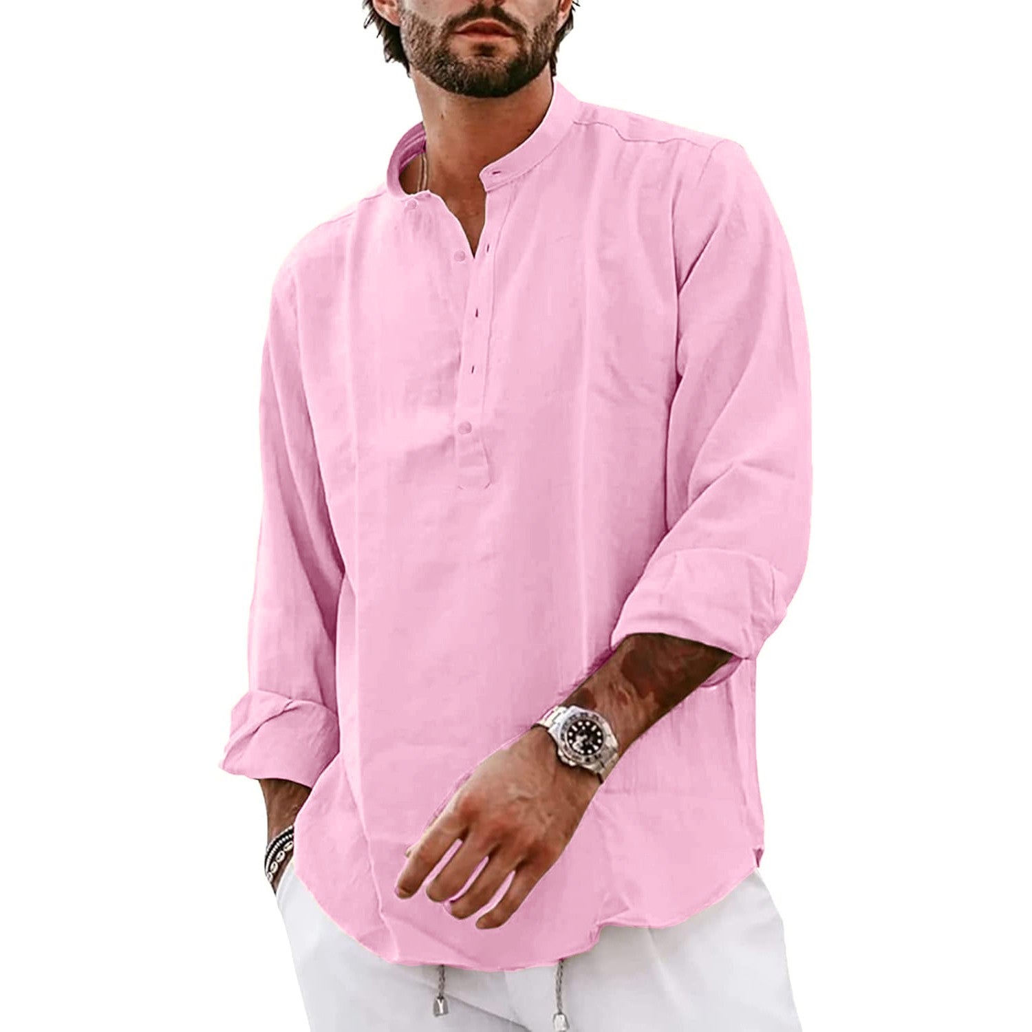 Men's Cotton Linen Shirts Long Sleeve Button Down Shirt Henley Collar Beach Shirts Hawaiian Vacation Casual Tops Men