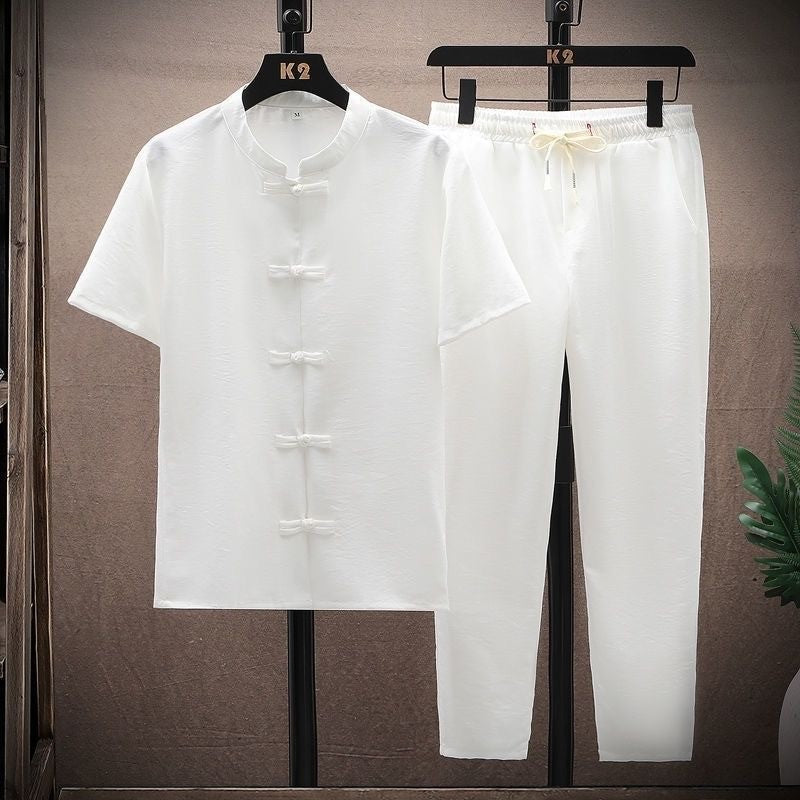 Summer New Fashion Solid Color Breathable Cotton and Linen Suit Men's Leisure Loose Sports Large Size High-Grade Two-Piece Set