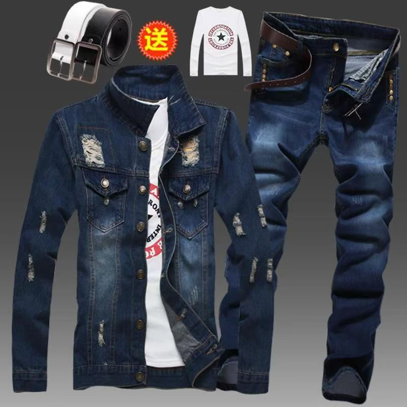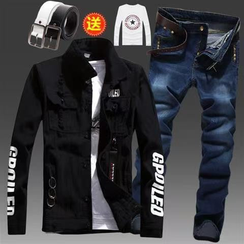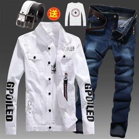 Men's Slim Fit Denim Jacket Pants 2pcs Set Long Sleeve Coats Letters Printed Casual Large Size Black White Red Boys Trousers