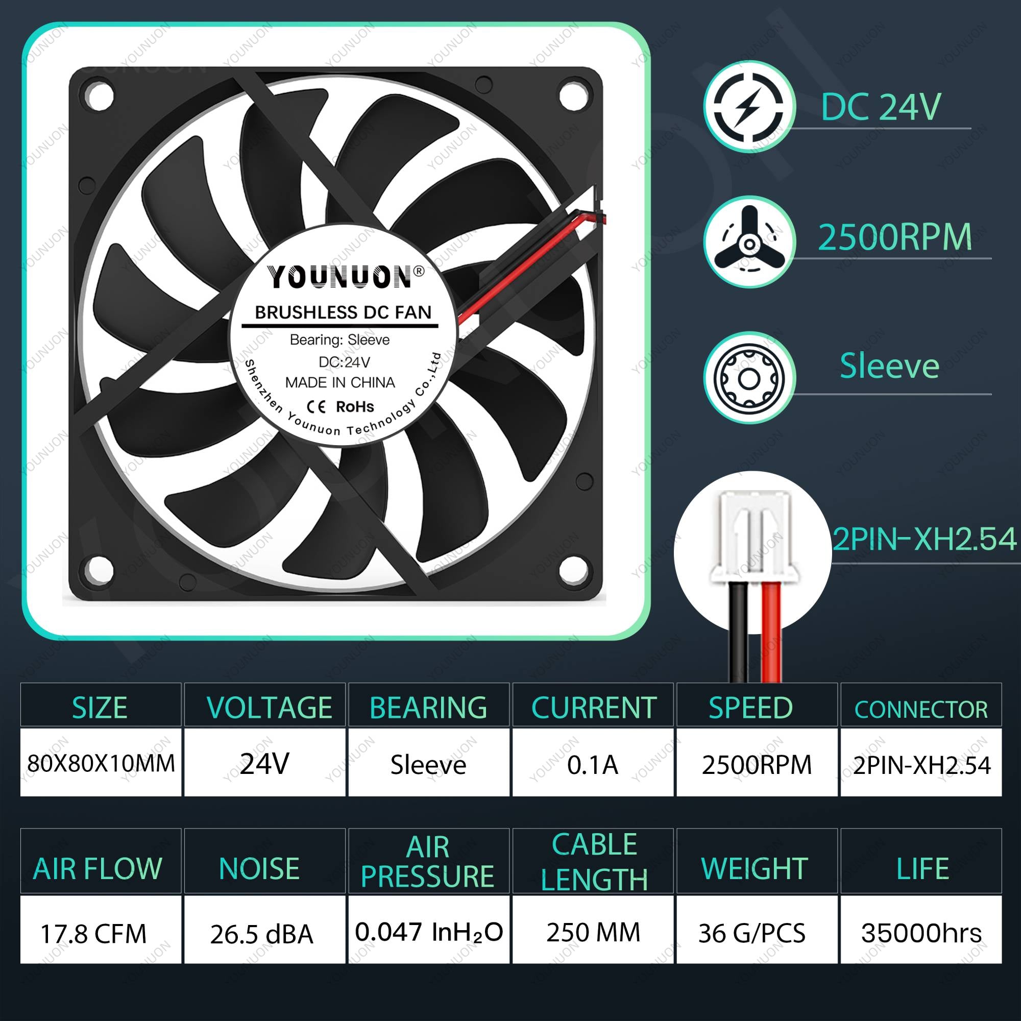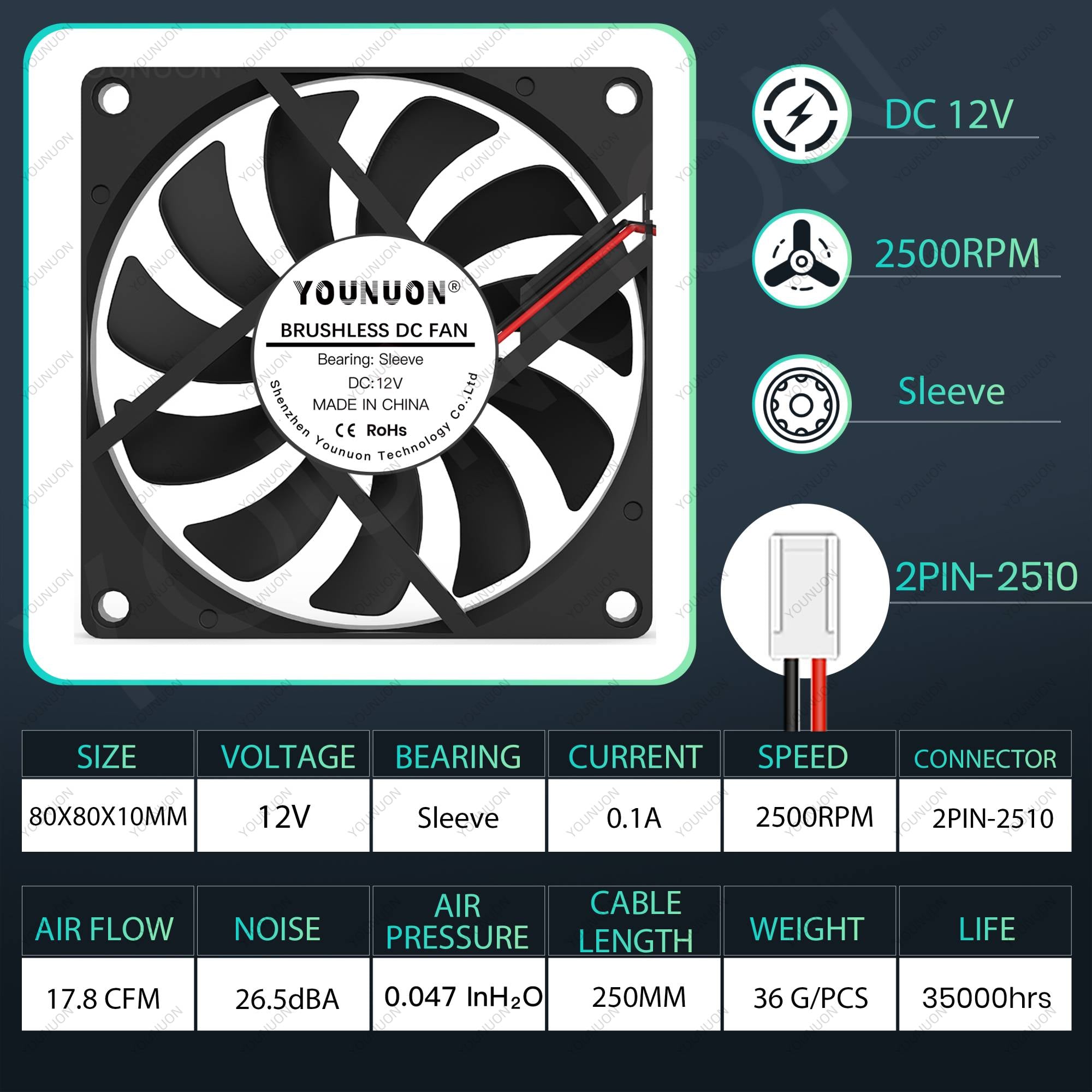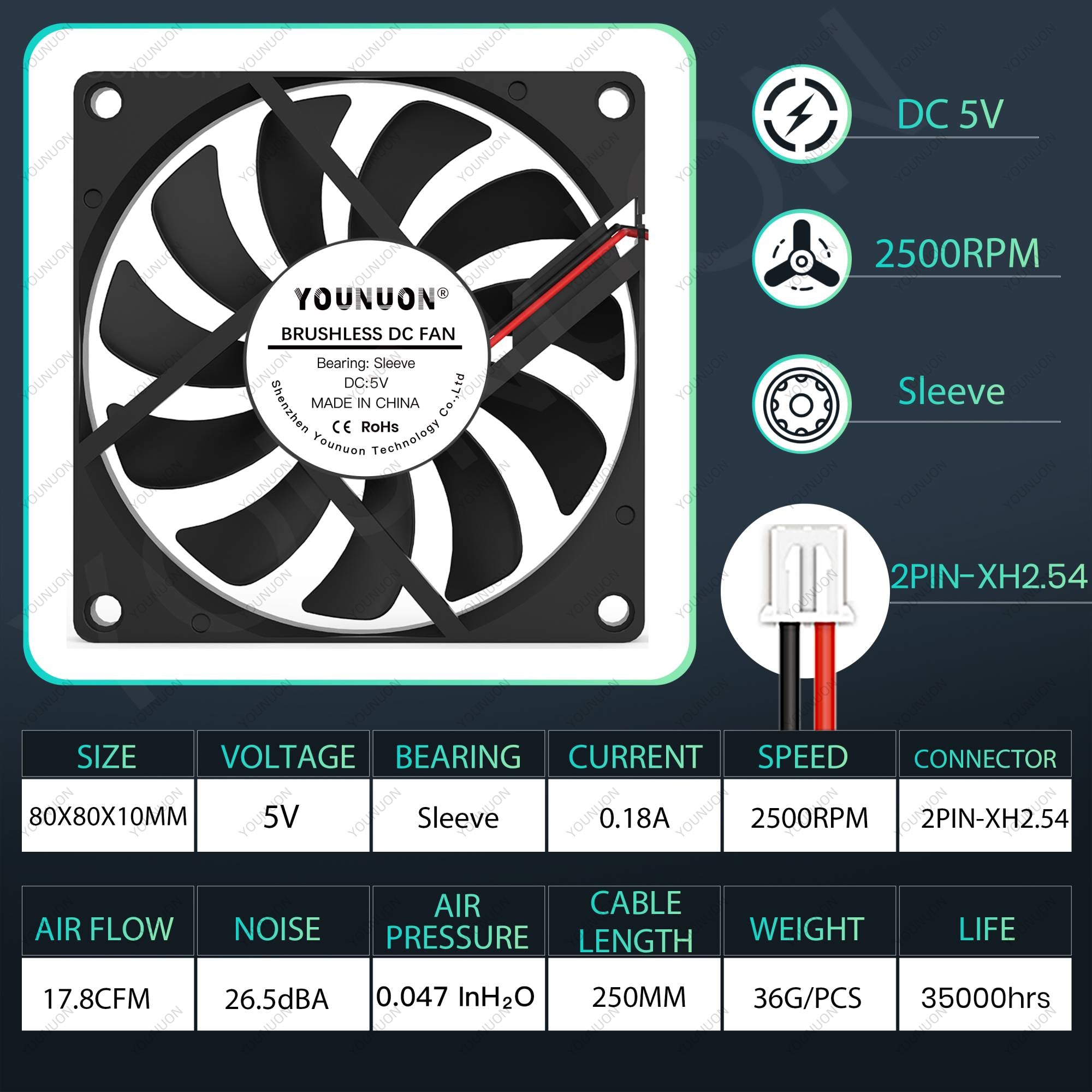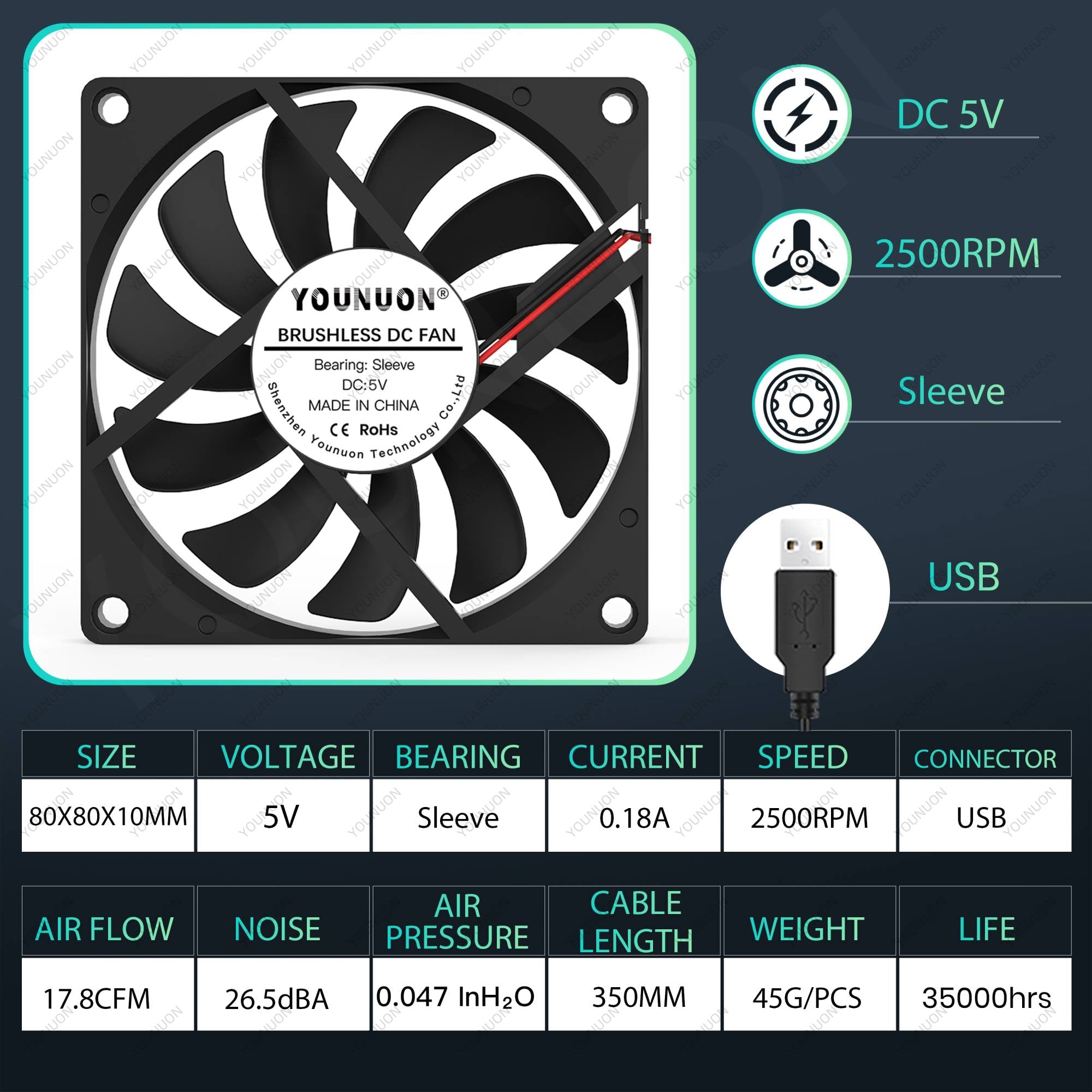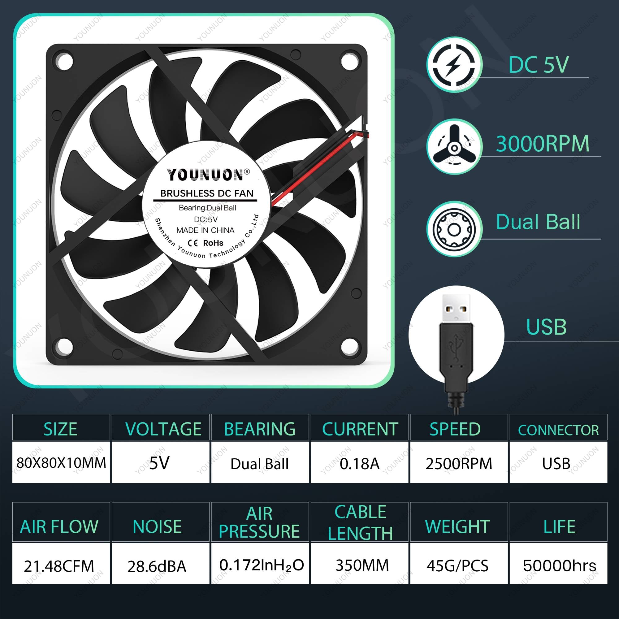 YOUNUON 80MM Fan 5V USB Fan 80x80x10mm 8cm DC 5V 12V 24V 8010 Fan Brushless Cooling Cooler PC Fan Computer Case Fan Cooler