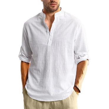 Cotton Linen Hot Sale Men's Long-Sleeved Shirts Summer Solid Color Stand-Up Collar Casual Beach Style Plus Size
