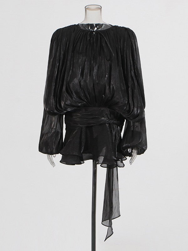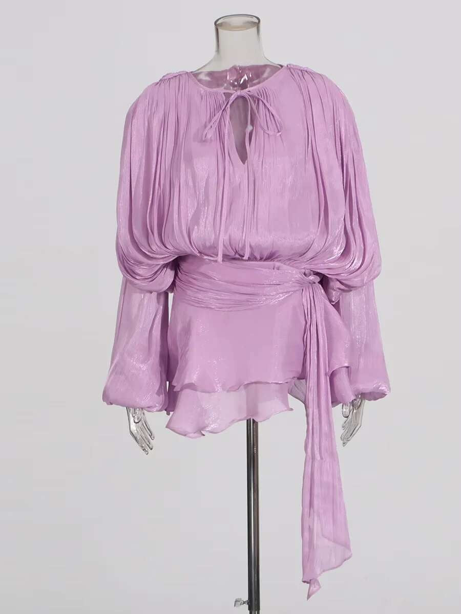 TWOTWINSTYLE Elegant Ruched Mini Dress For Women Round Neck Lantern Long Sleeve