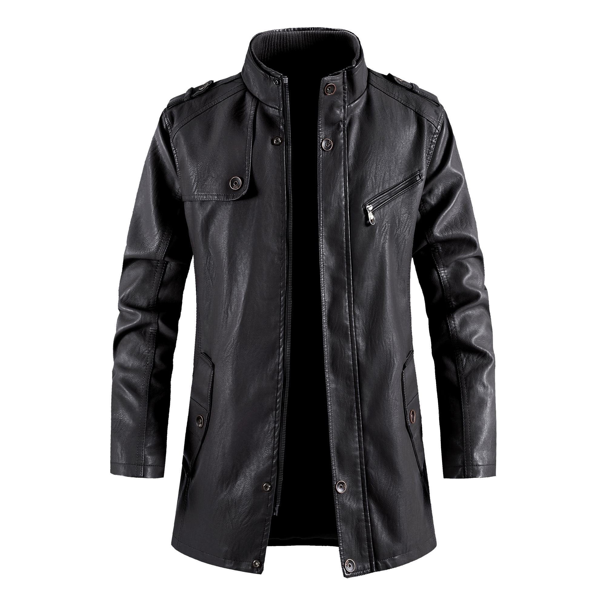 New Winter Long PU Leather Jackets Men Stand Collar Windbreaker Faux Outerwear Motorcycle Casual Warm Leather Coats Man Clothing