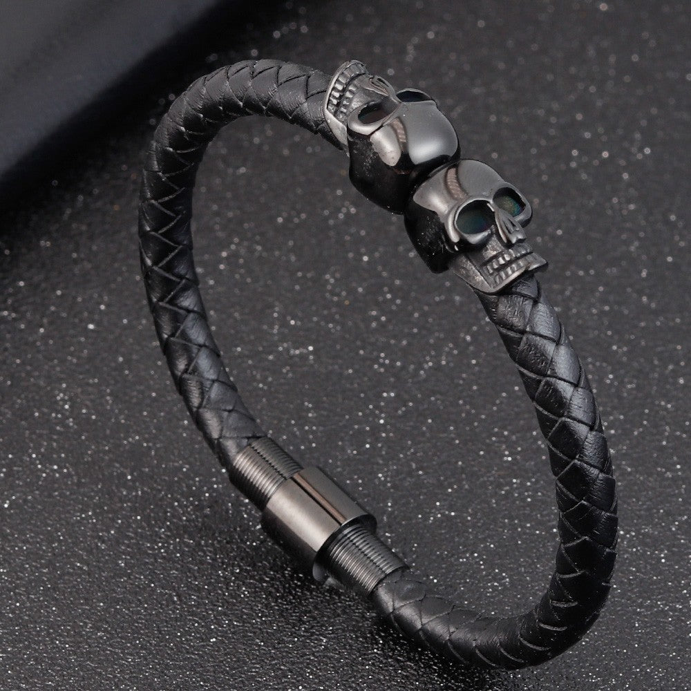 Hyperbole Men Jewelry Black Braided Leather Bracelets Stainless Steel Leahter Bracelets Cool Skull Bracelets Men Bracelet