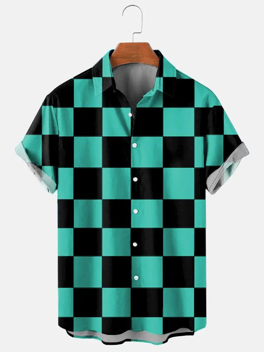 Summer Men's Geometric Grid Plaid Shirts Short SleeveTurndown Hawaiian Shirt Button Up Shirts No Pockets Shirts