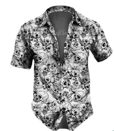 Men's casual Hawaiian lapel 3D horror skull retro printed button short sleeved shirt