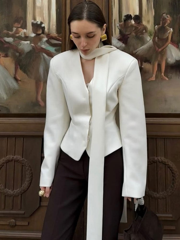 Tossy Elegant Female Striped Suit Coat For Women Scarf Lace-Up Patchwork V-Neck Long Sleeve Luxury Outwear Female Jackets Coat