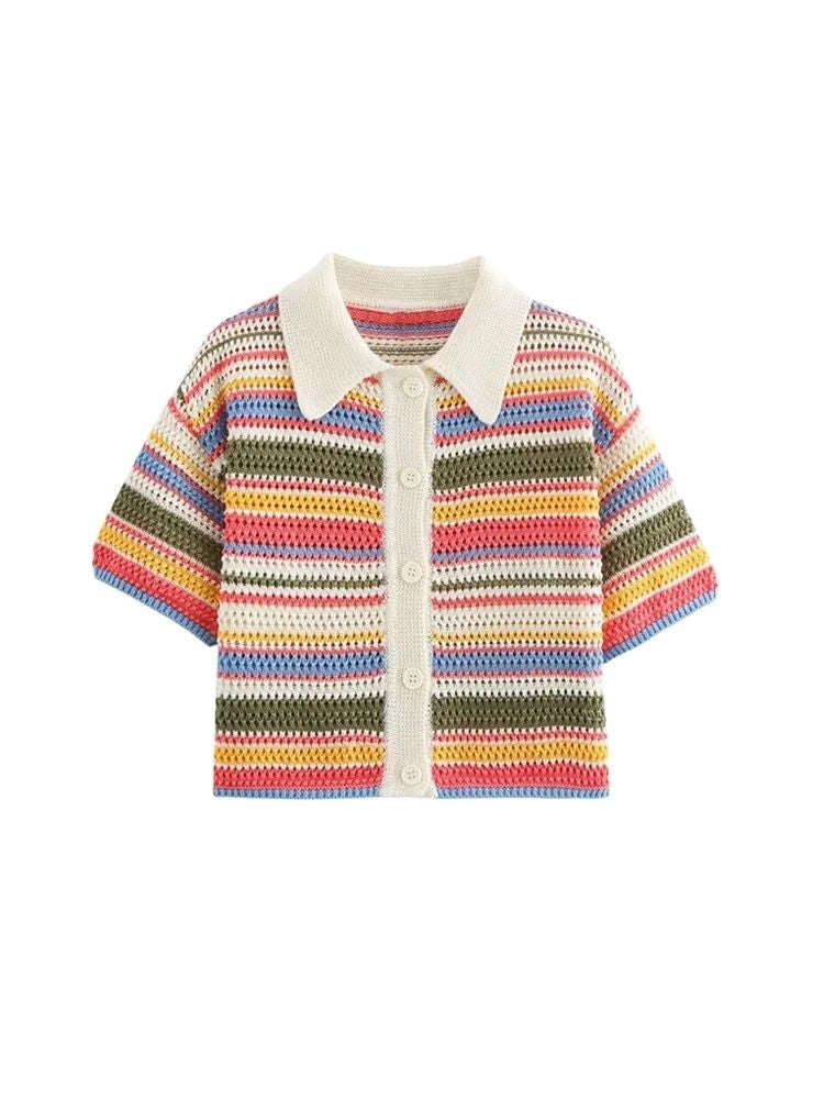 TRZA-Women's Striped Crochet Knit Crop Sweater, Polo Collar, Short Sleeve, Button-up, Female Outerwear, Chic Tops, Fashion