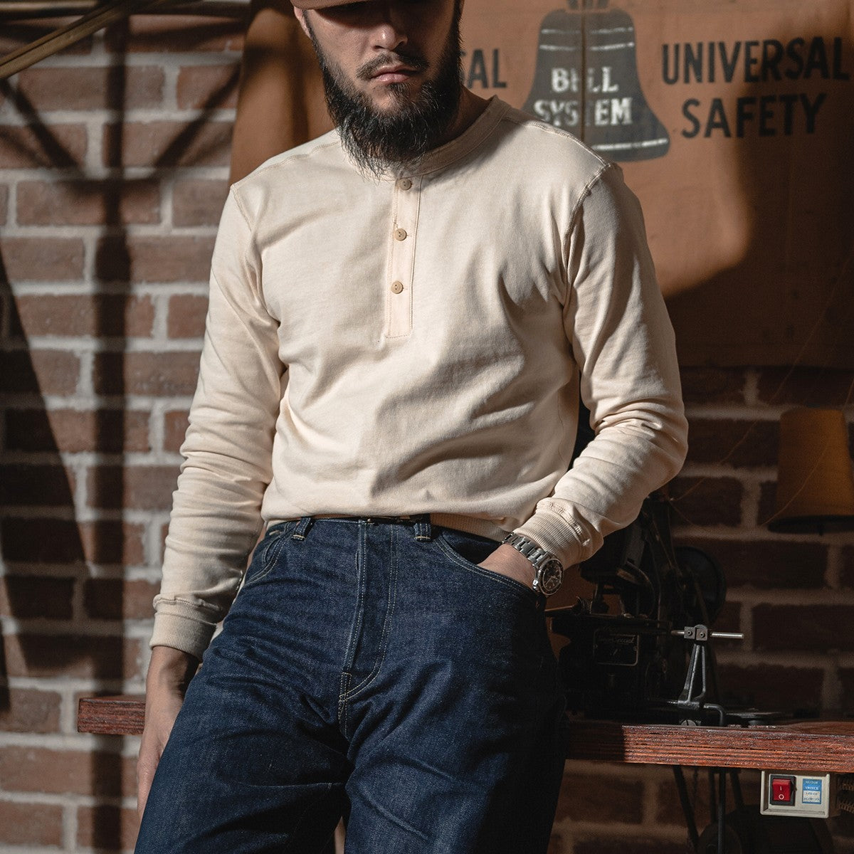 Bronson 350g Heavyweight L/S Henley Shirt Vintage Plain Base T-Shirt For Men