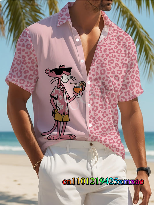 Summer New Men's Lapel Short Sleeve Hawaiian Shirt Leopard & Pink Panther Print Hawaii Vacation Casual Fashion Kids/Adult Tops