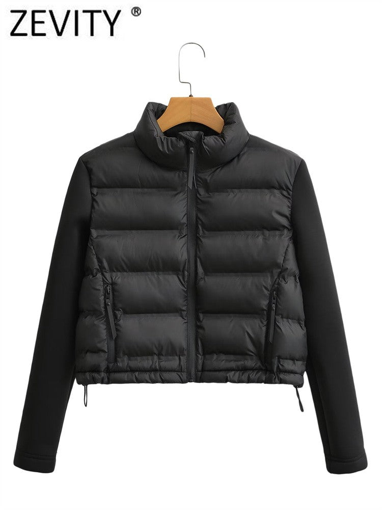 ZEVITY Women Fashion Stand Collar Long Sleeve Patchwork Quilted Cotton Jacket Coat Femme Outerwear Chic Zipper Short Tops CT5817