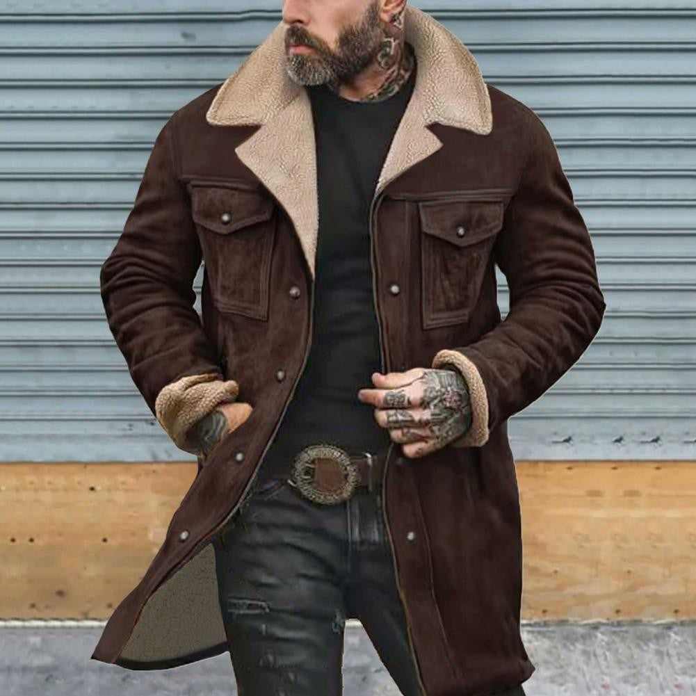 Autumn Winter Men Jacket Lapel Single-Breasted Mid-Length Coat Windproof Jacket Suede Multi Pockets Outerwear Men Clothing