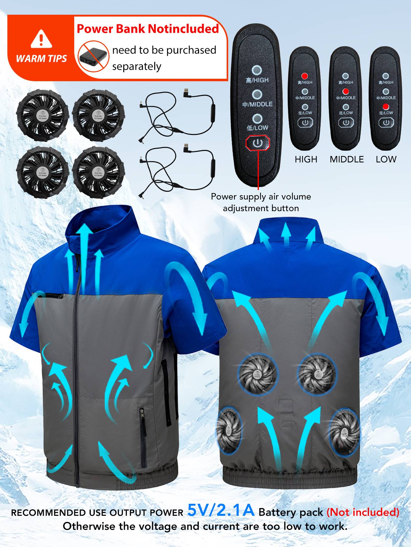 Short sleeved 4-hole fan suit?Three speed air volume regulation?With 4 fans,9-blade high-power fan?High air volume