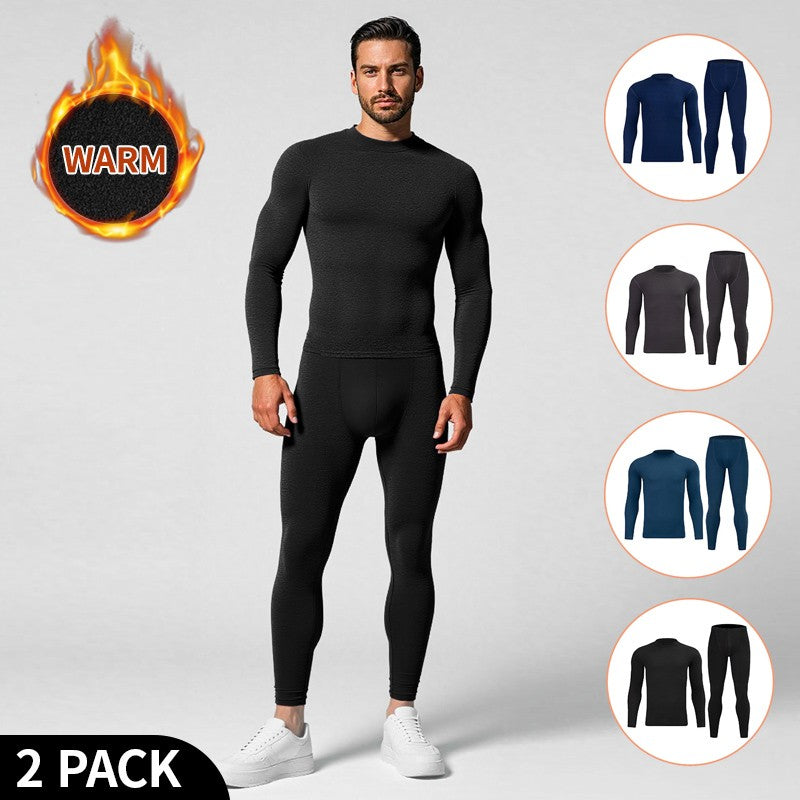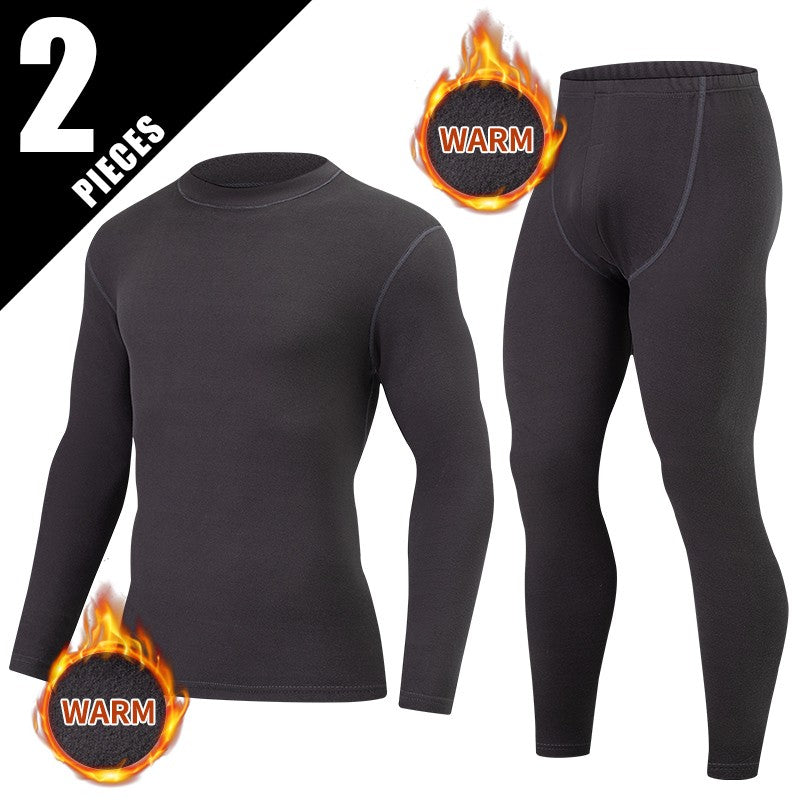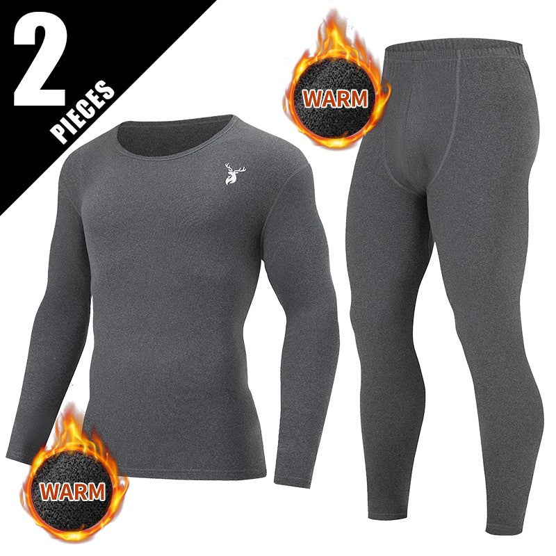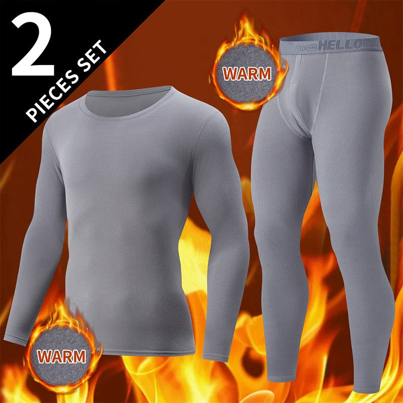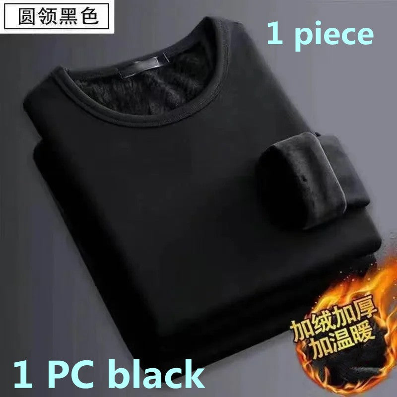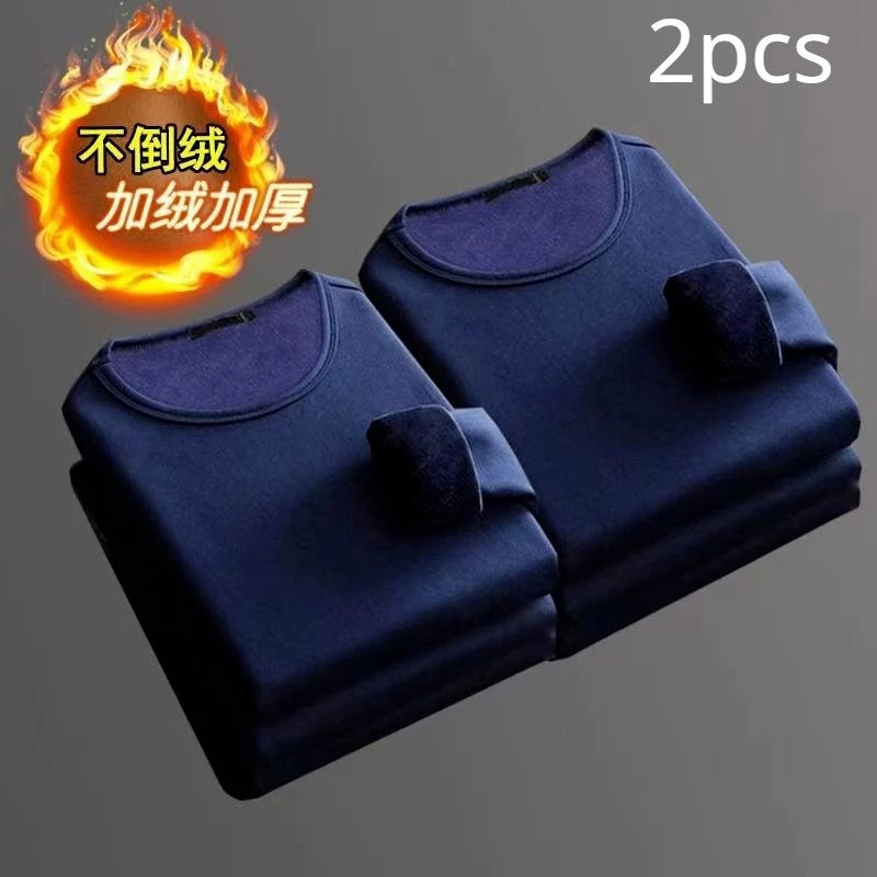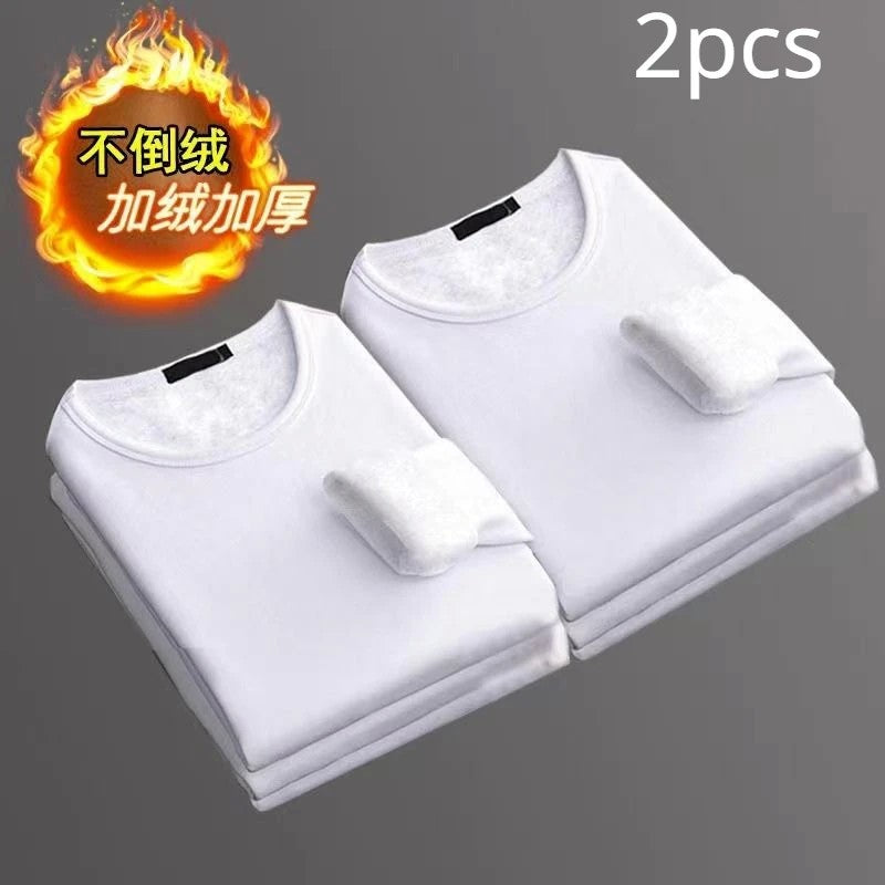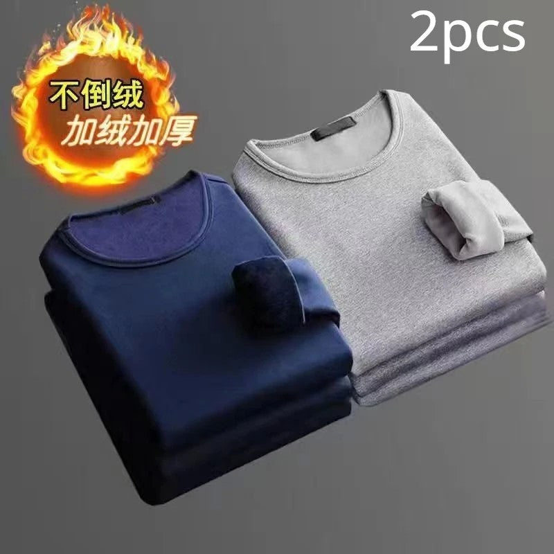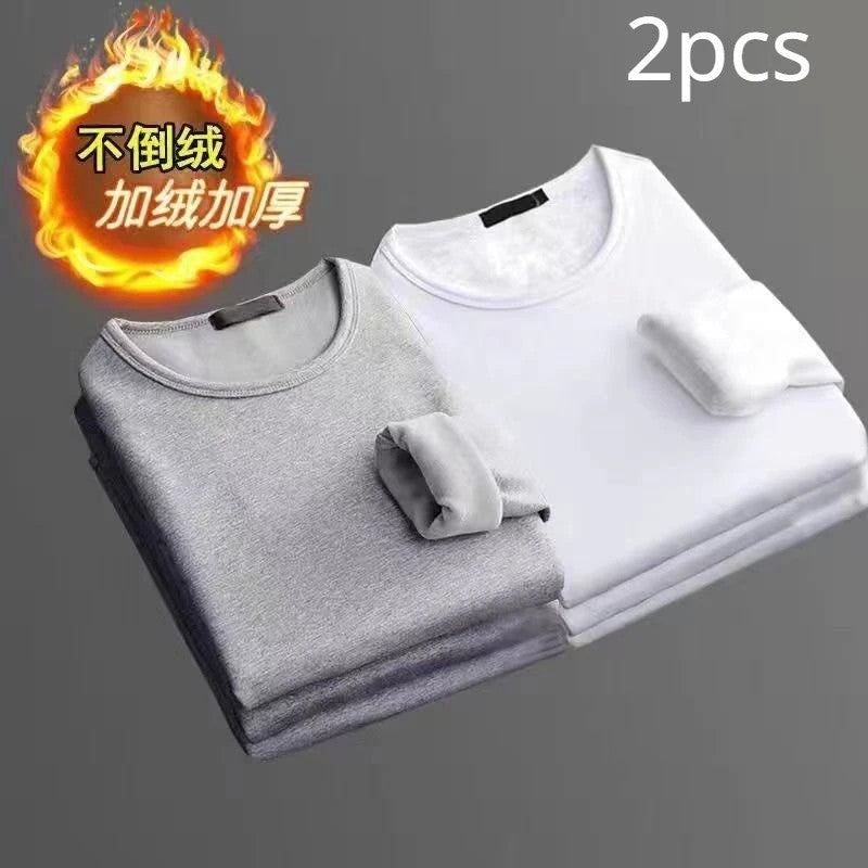 2PCS Men's Underwear Winter Long-sleeved Thermal Underwear Plus Velvet Padded T-shirt O-Neck Solid Color Slim Bottoming Shirt
