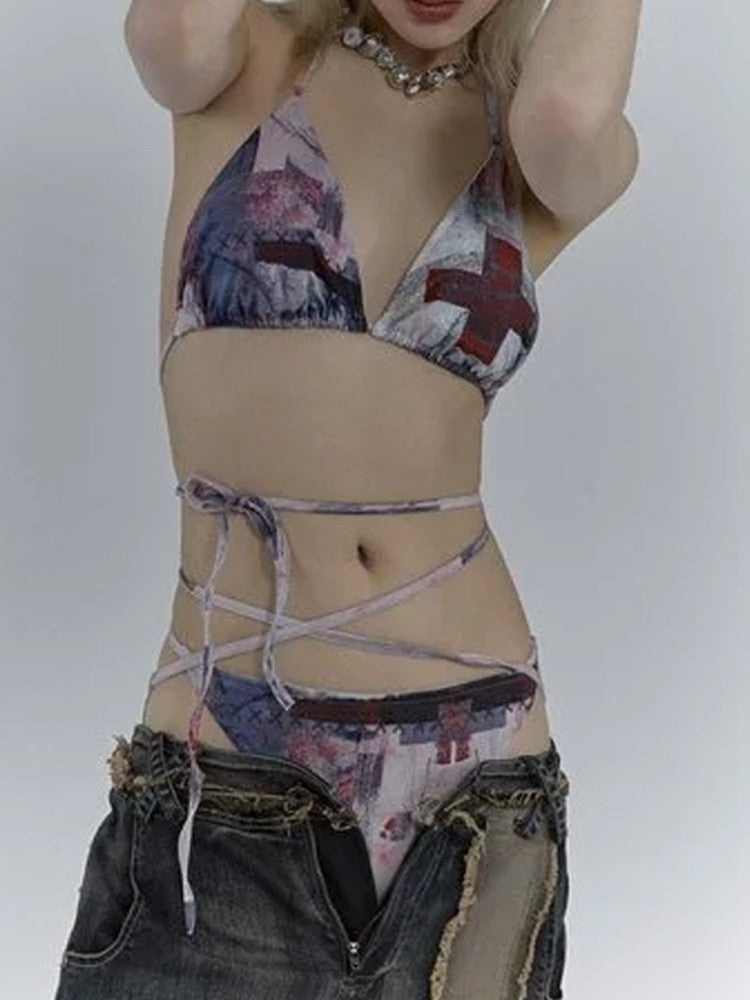 Y2k subculture retro millennium girls style hanging neck suspender bikini set summer beach kawaii classic comfortable bikini set