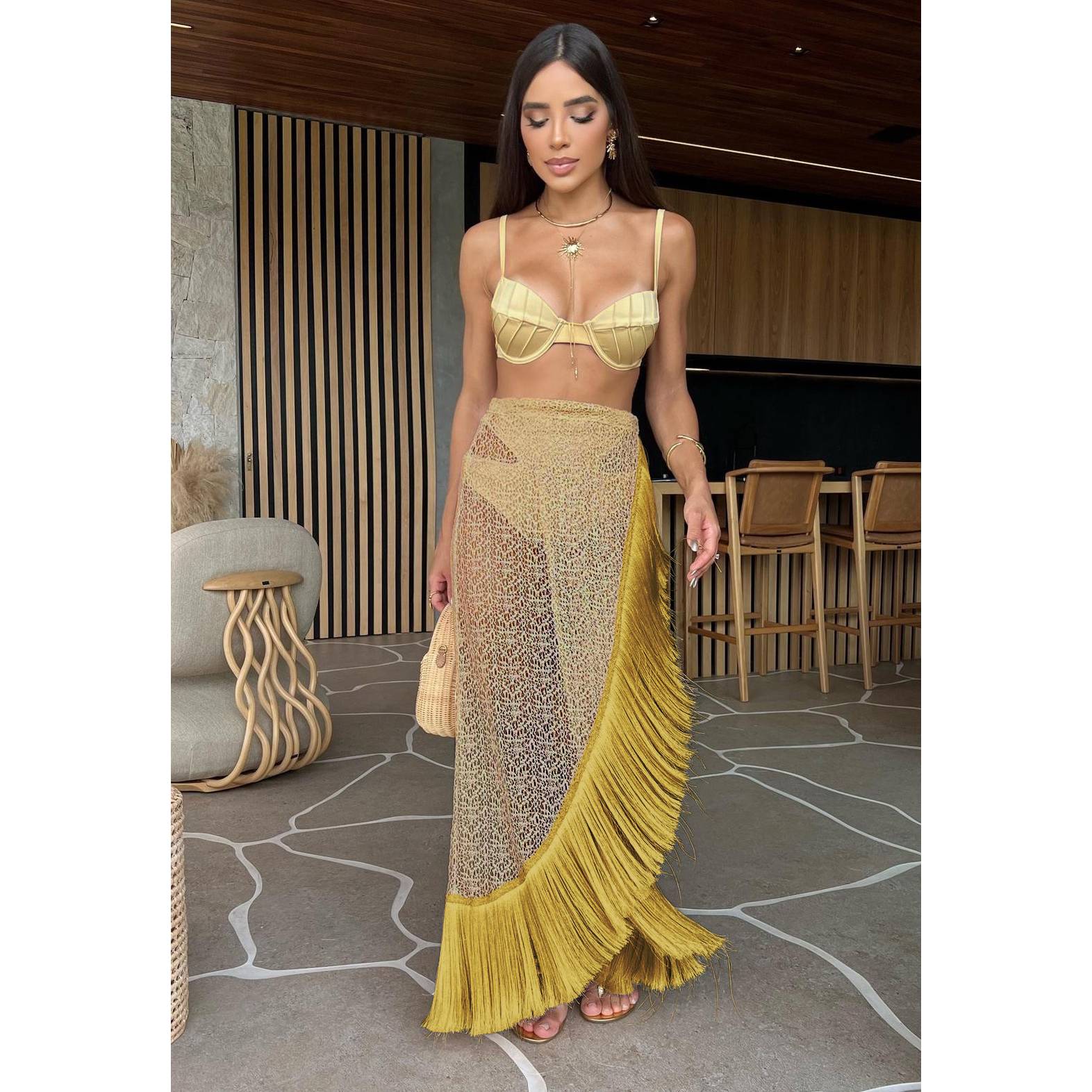 Swimsuit 3 Pcs Set with Tassel Skirt Bikini Women Swimsuit Button High Waist Swimwear Bathing Suit Beachwear Biquini