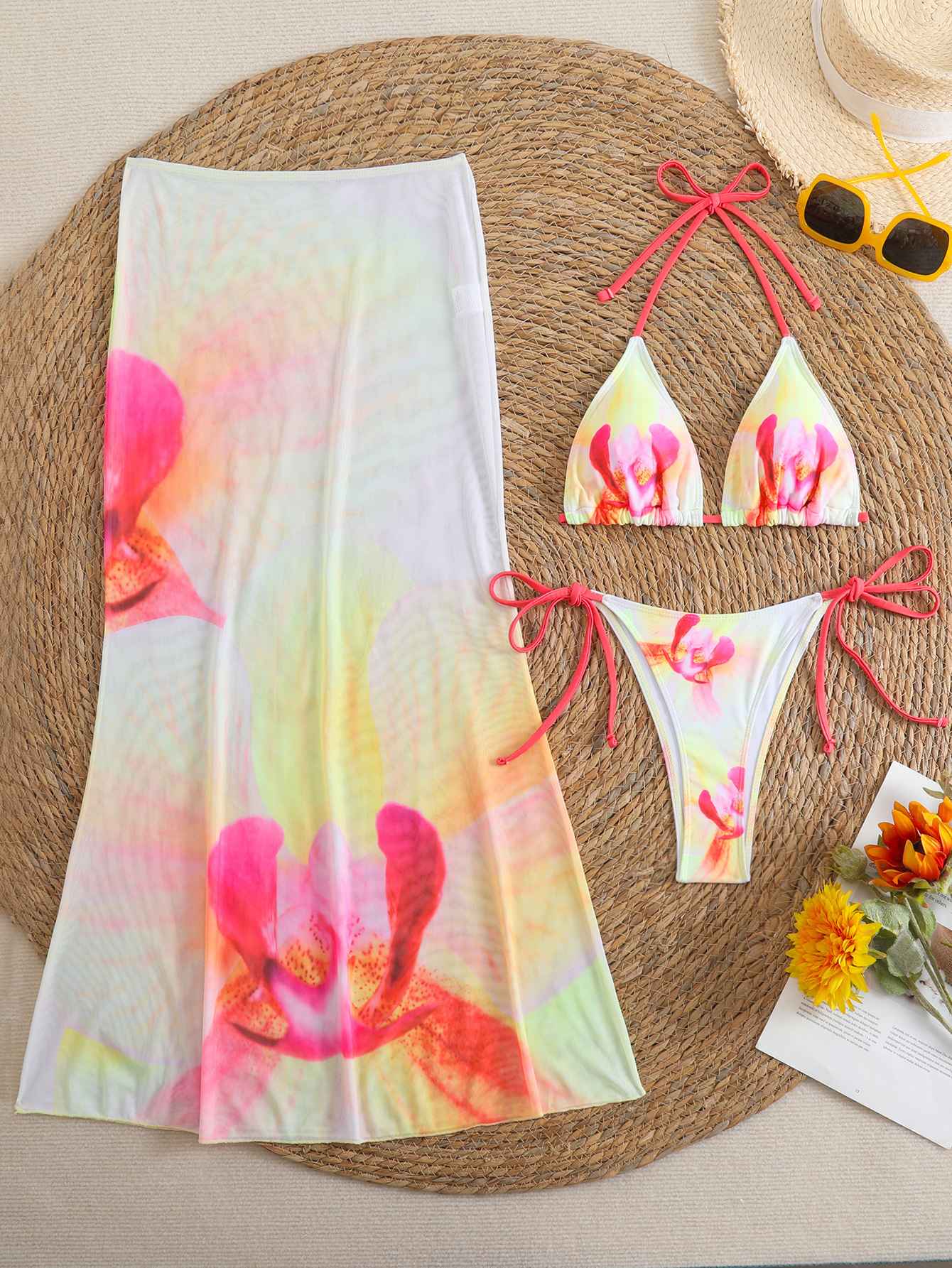 2025 New Flower Print Bikini Set Women's High Waist Long Skirt 3 Piece Swimsuit Sexy Mini Triangle Backless Thong Bathing Suit