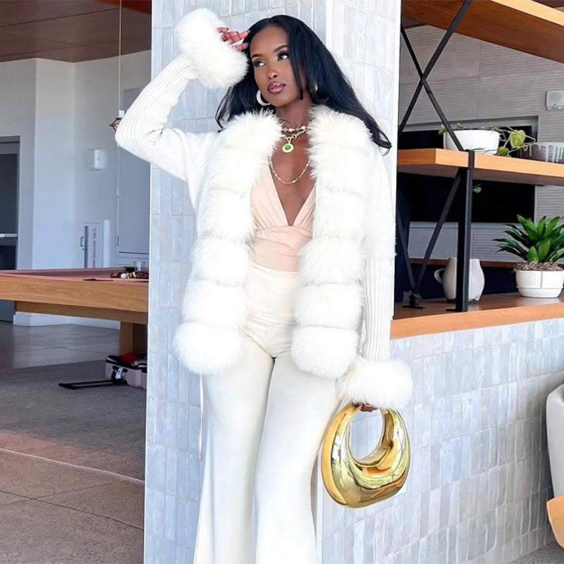 Elegant Knitted Faux Fur Patchwork Women's Coat Thicken Lady Coats 2025 Autumn Winter Chic Female Street Warm Outerwears