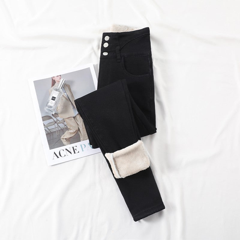 Winter Lady Thermal Plush Jeans Snow Warm Stretch Jeans Hot Sale High Waist Fleece Pants Female Straight Leg Denim Trousers