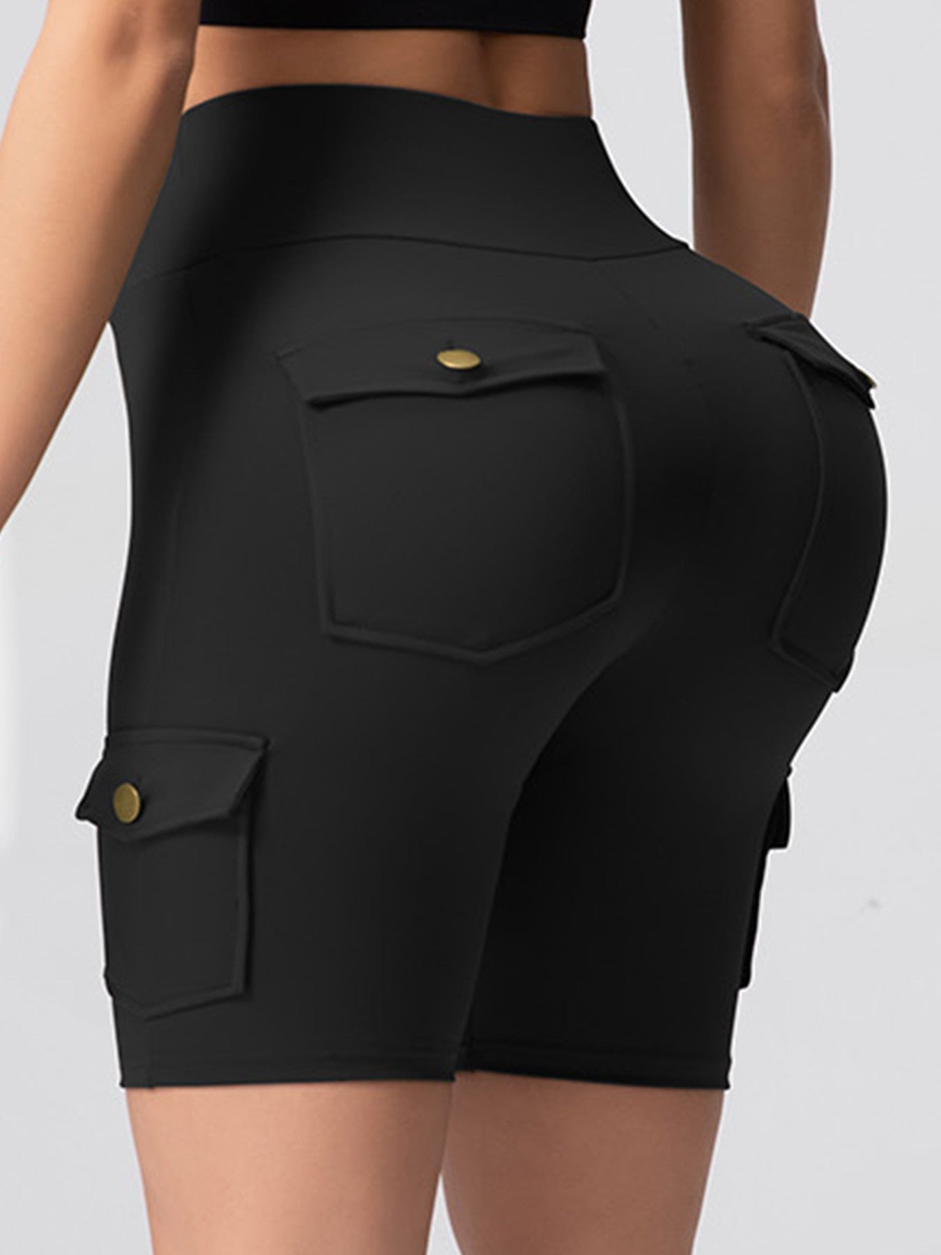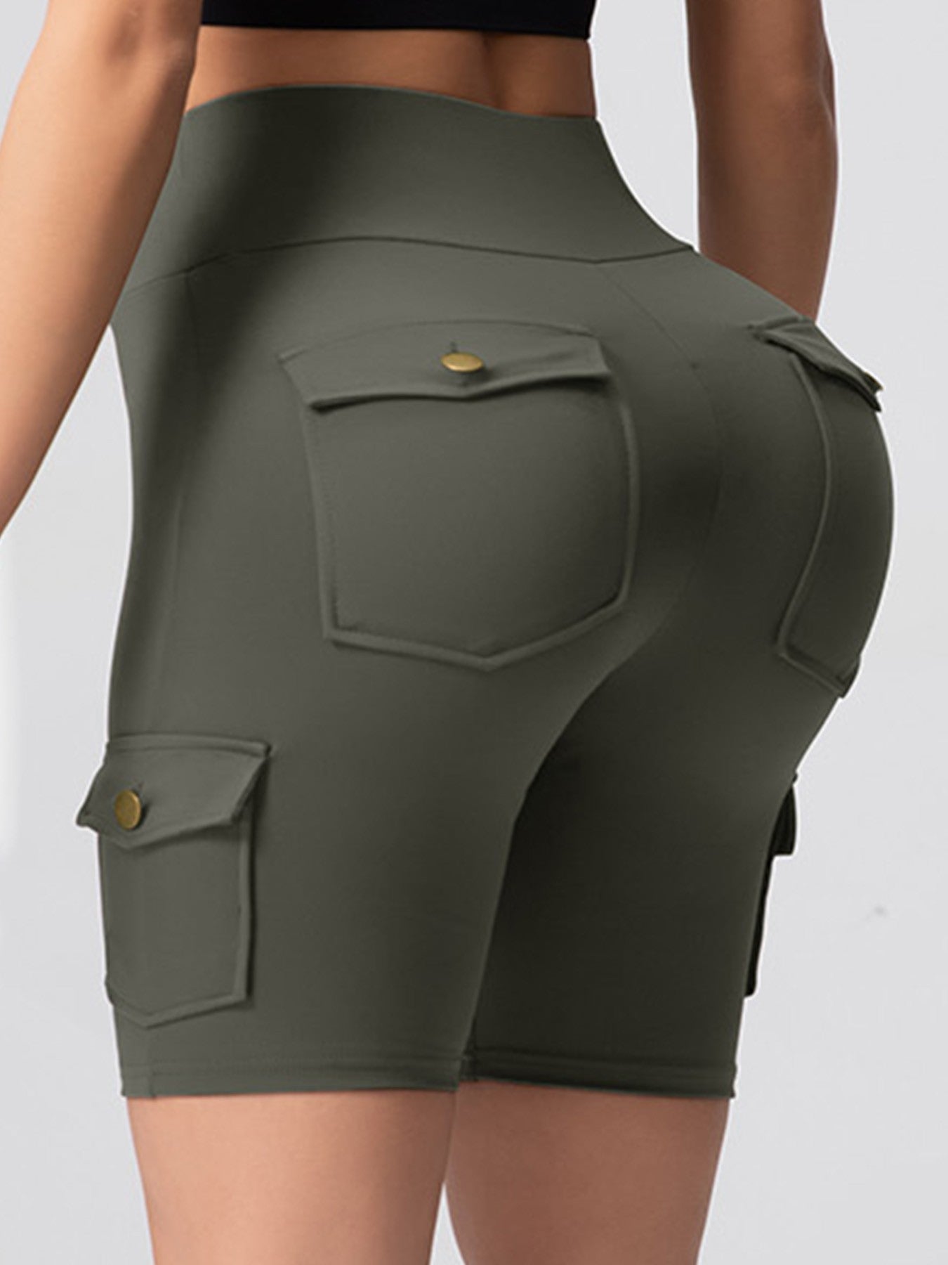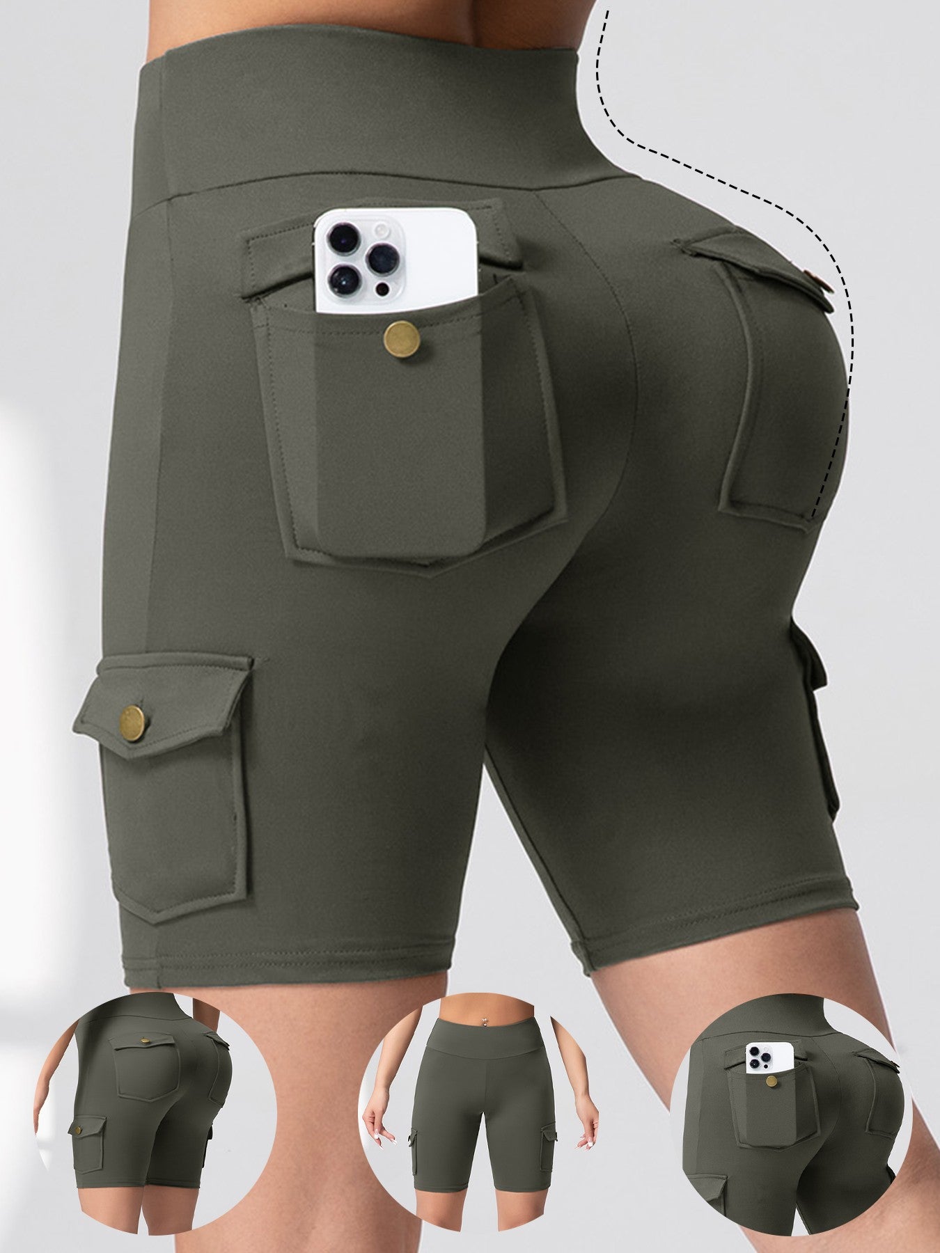 Multi-Pocket Solid Color Women Shorts Butt Lifting Multi-Pocket Workwear 5-Port Pants Elastic Slim Fitness Tights Cycling Short
