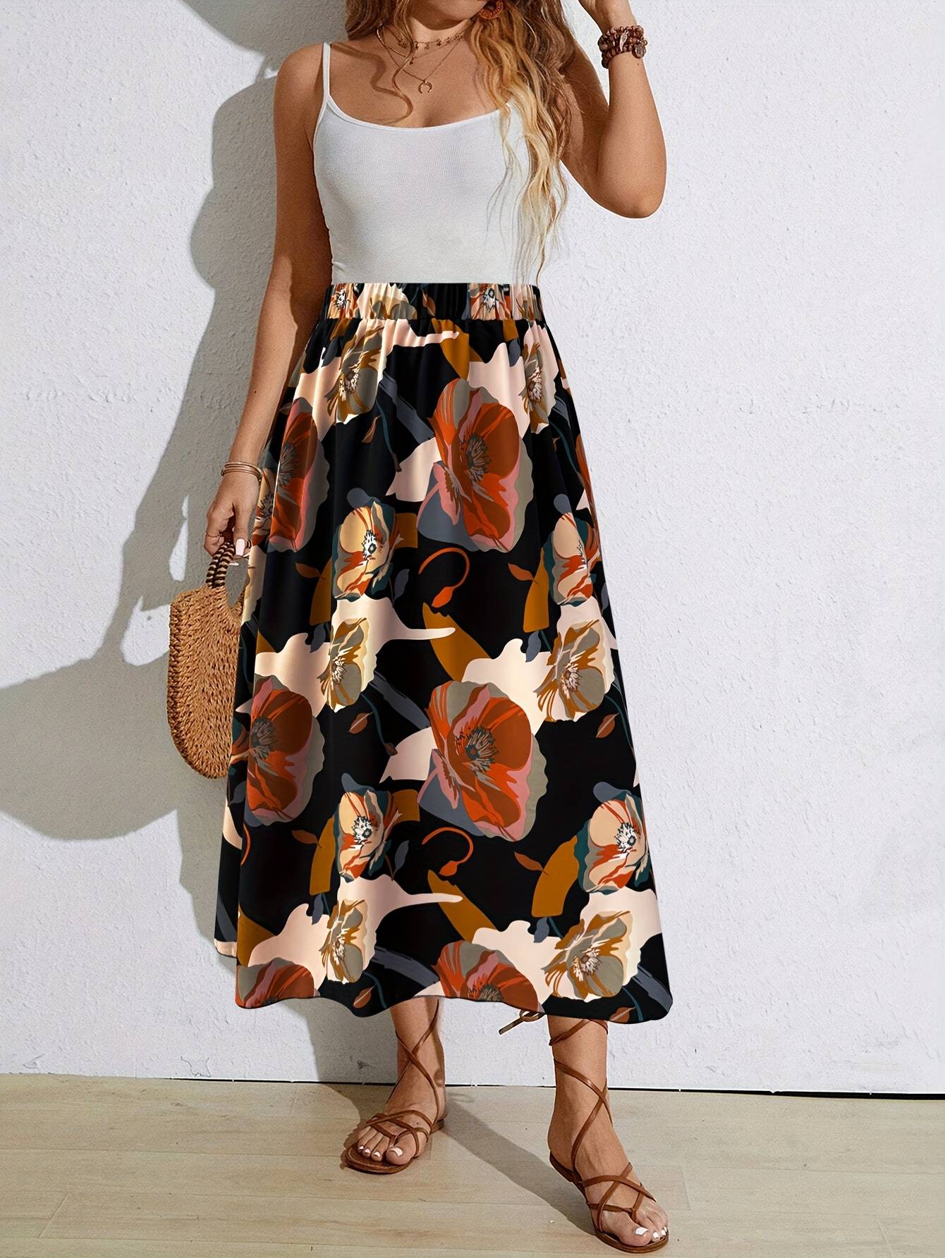 2025 Plus Size Fashion Selection! Black Floral - Print Elastic - Waist Midi Skirt (Plus Size). The Colorful Floral Patterns Are