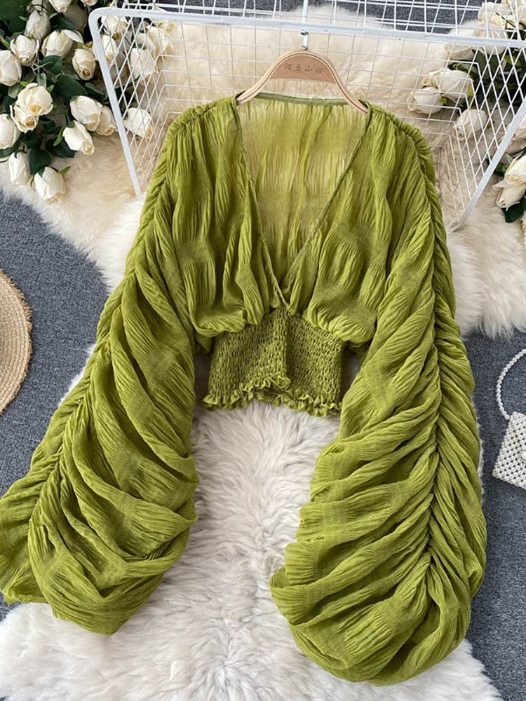 Summer Sexy Draped Chiffon Blouse For Women Elegant V-Neck Puff Long Sleeve Short Tops Female Slim Party Shirts 2022 New Fashion