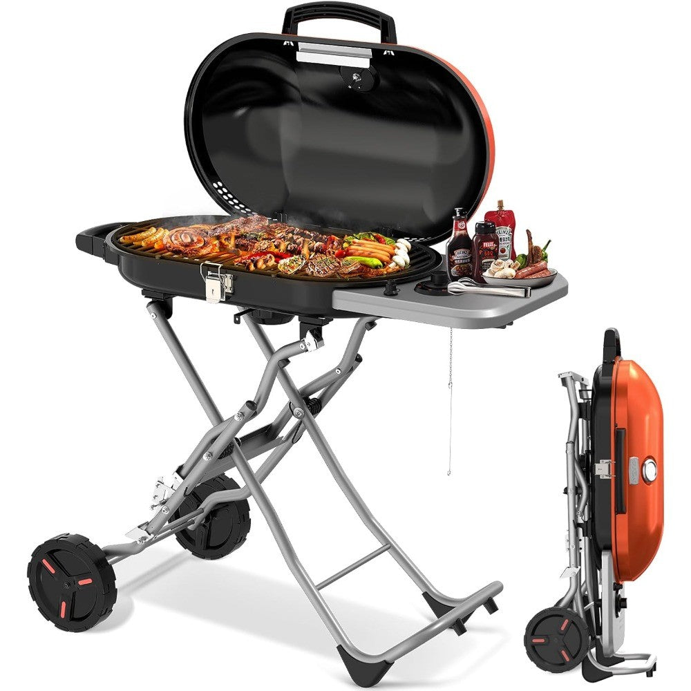 Portable Propane Gas Grill, 15,000 BTU BBQ Grill with Top Cover Lid, Folding Legs & 2 Wheels, 406 sq.in. Grilling Areas