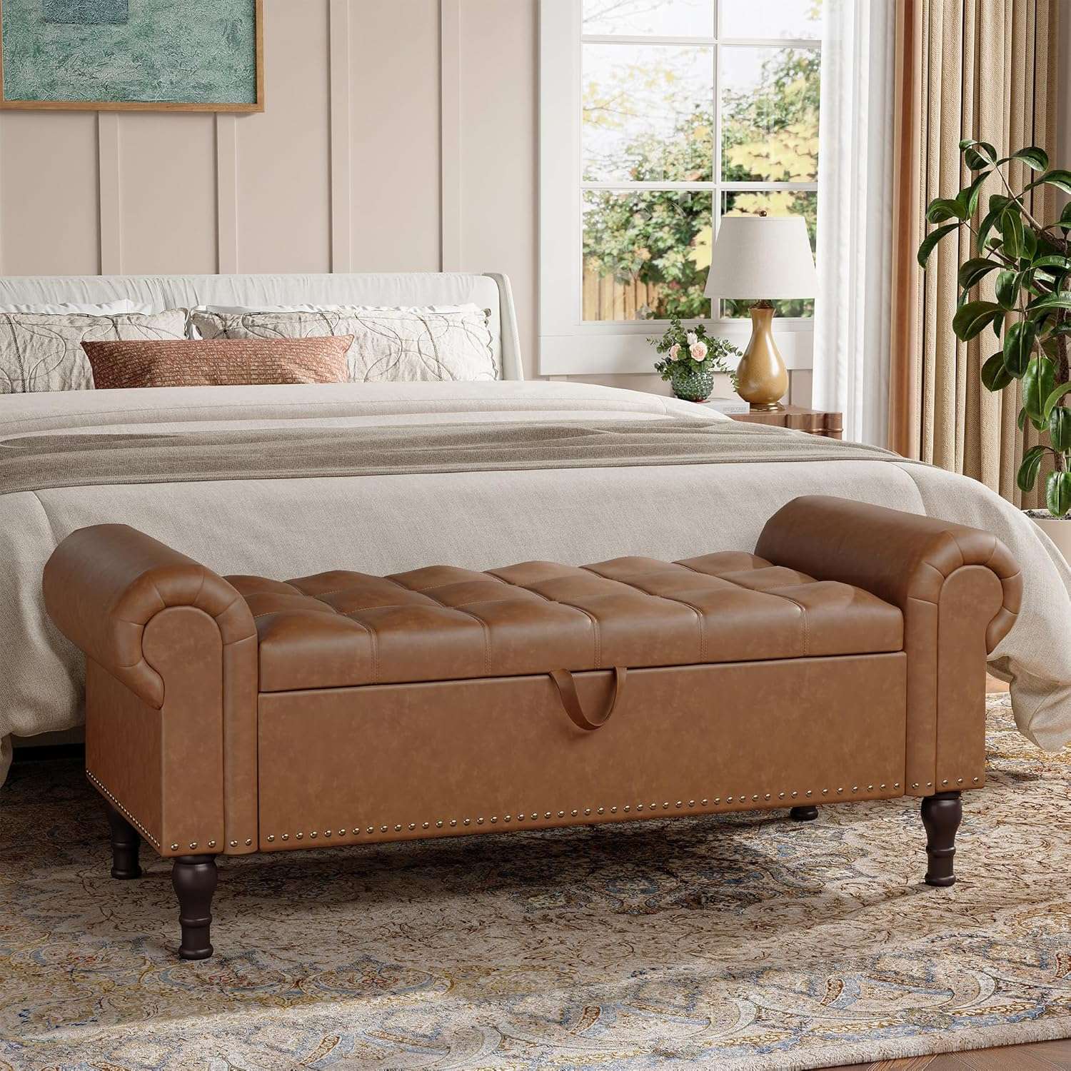Storage Ottoman Bench for Bedroom, 51" Upholstered Bedroom Bench with Rolled Arms and Vintage Rivets, Large Storage Chest for Li