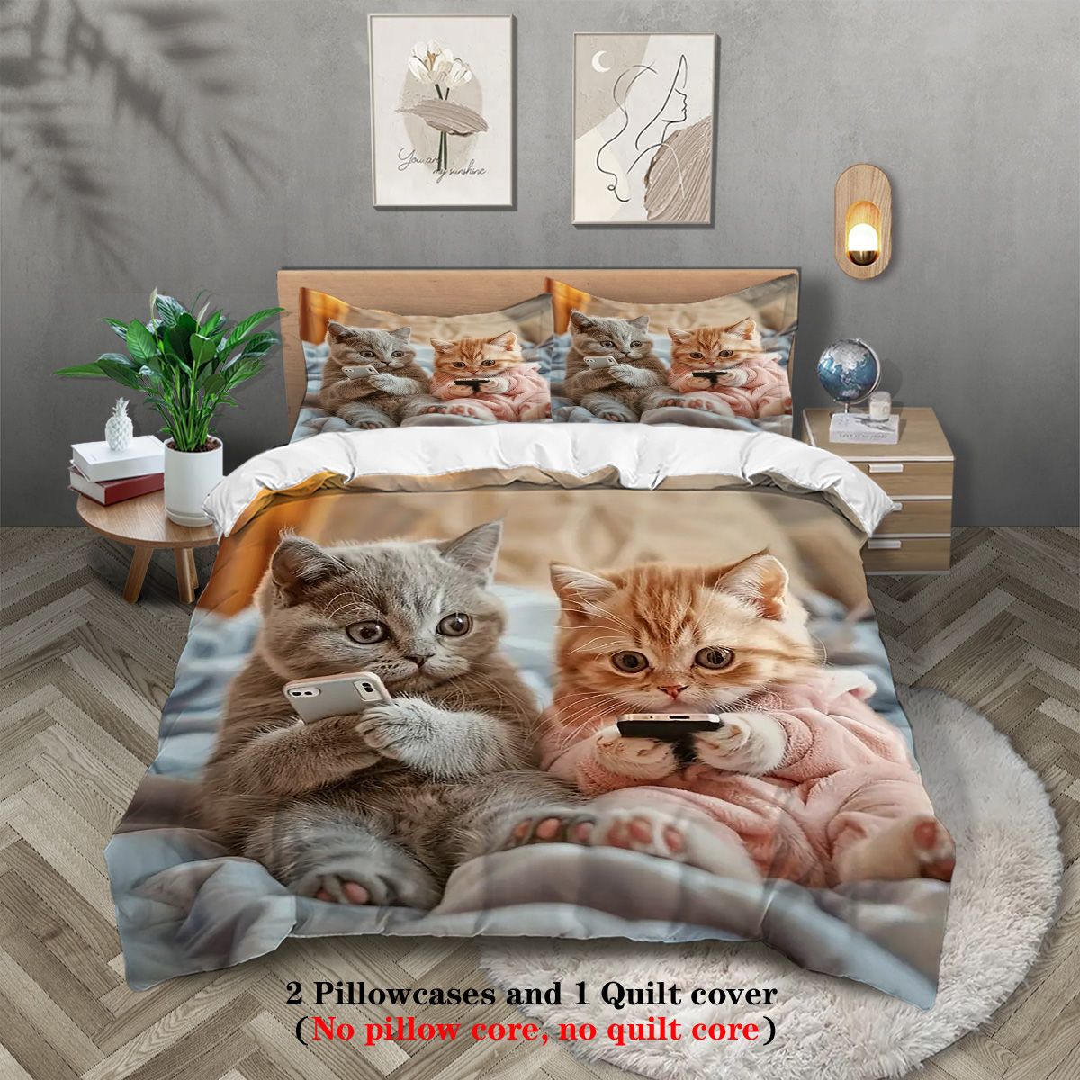 3PC Cute Cat Printed Bedding Set for Four Seasons,coreless, Comfortable, Bedroom Dormitory, Multiple Sizes, Machine Washable