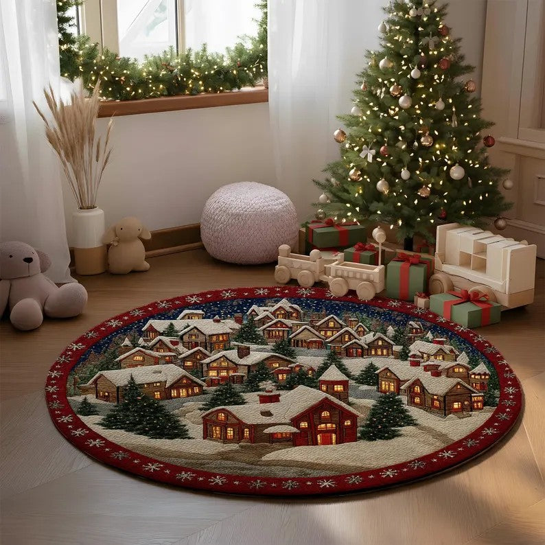 3D Christmas Village Rug Festive Round Carpet Snowy Cottage Design Cozy Holiday Decoration for Living Room Bedroom or Gift Idea