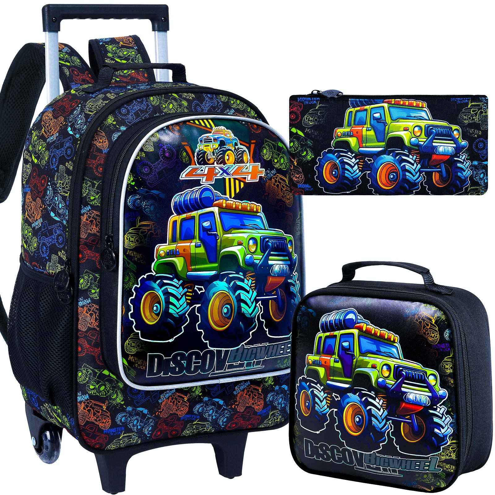 3PCS Rolling Backpack for Boys, Kids Roller Wheels Bookbag, Wheeled School Bag with Lunch Bag