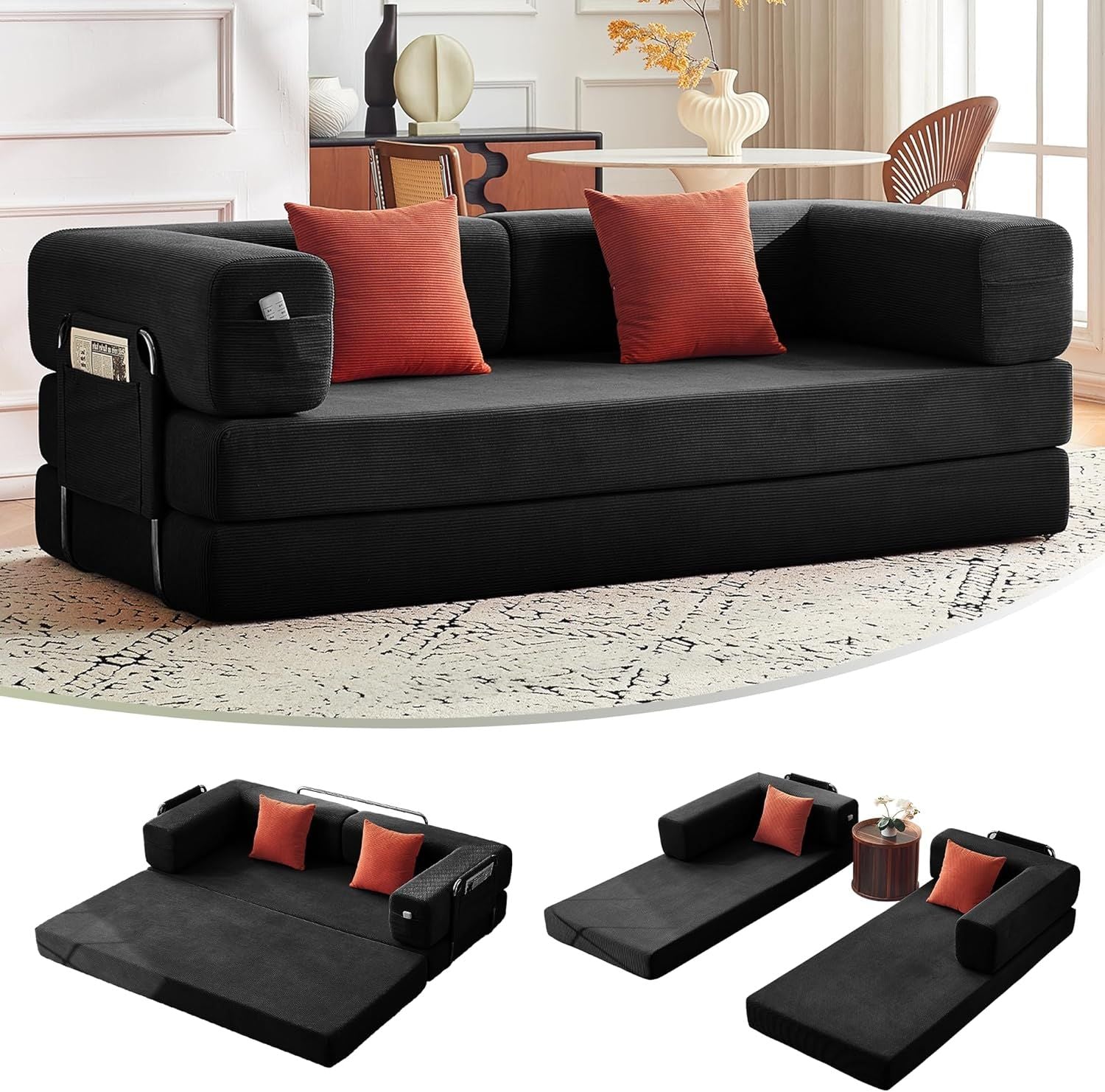 79" Convertible Sofa Bed with Pillows, Corduroy Folding Sleeper Sofa with Fixed-Shape Frame, Boneless Couch for Living Room
