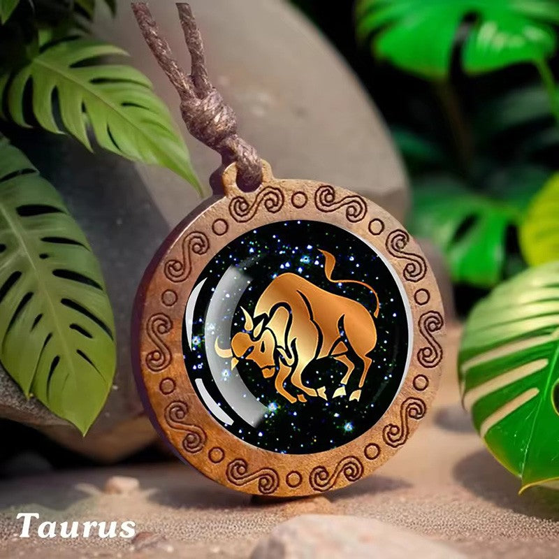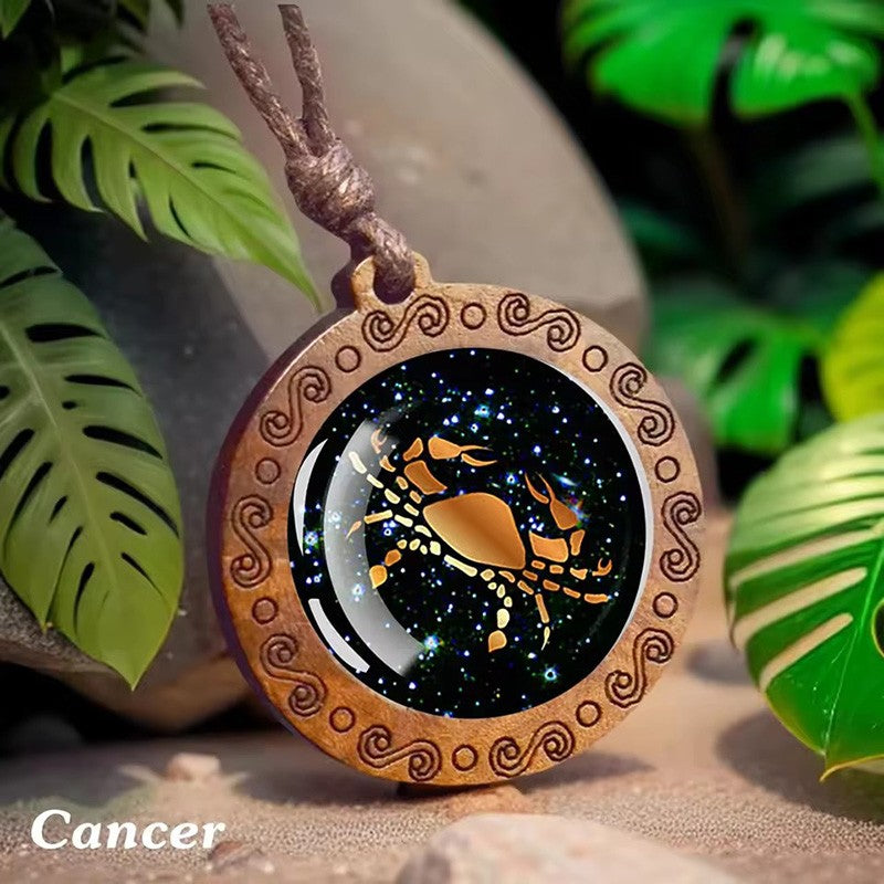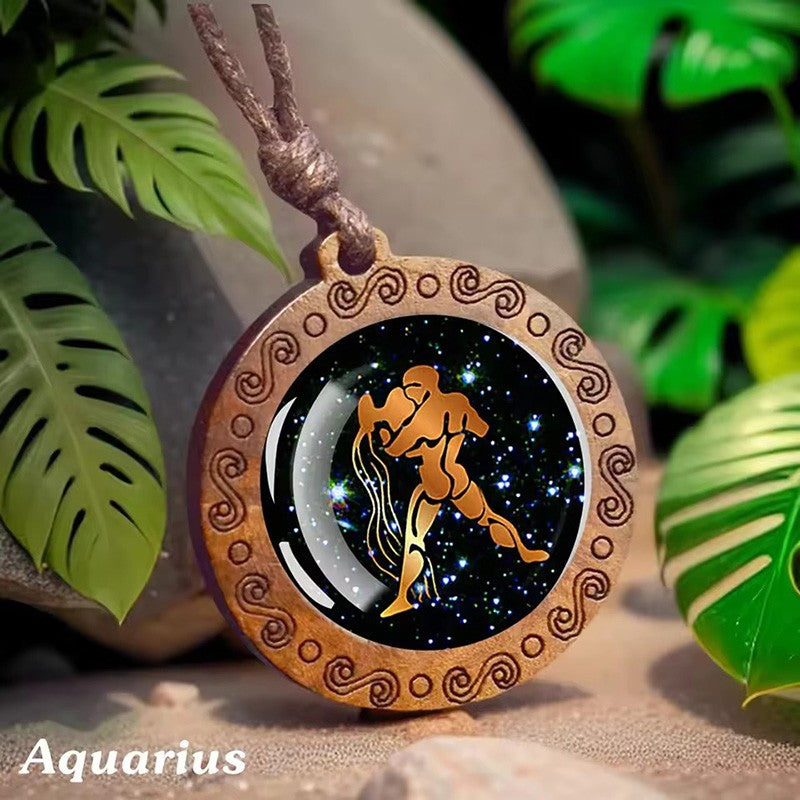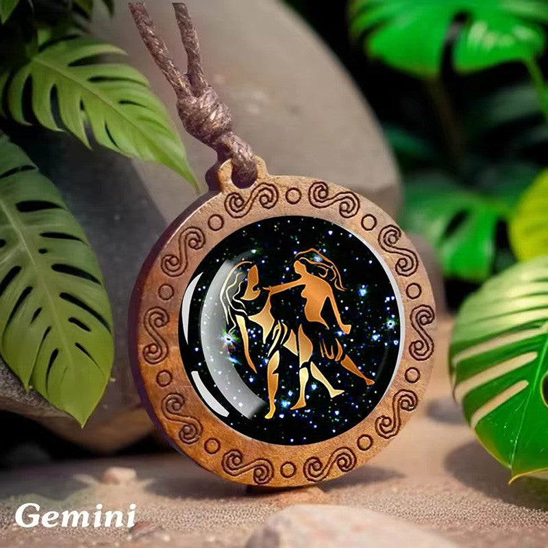 Vintage 12 Zodiac Sign Glass Wooden Necklace Adjustbale Long Rope Chain Necklace Constellation Jewelry