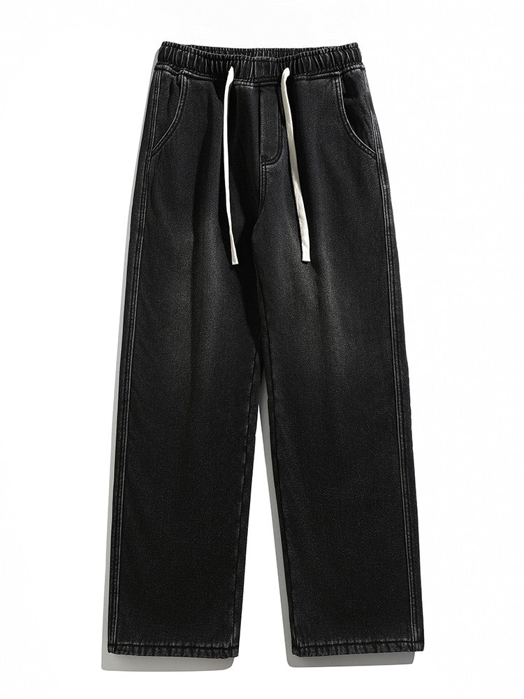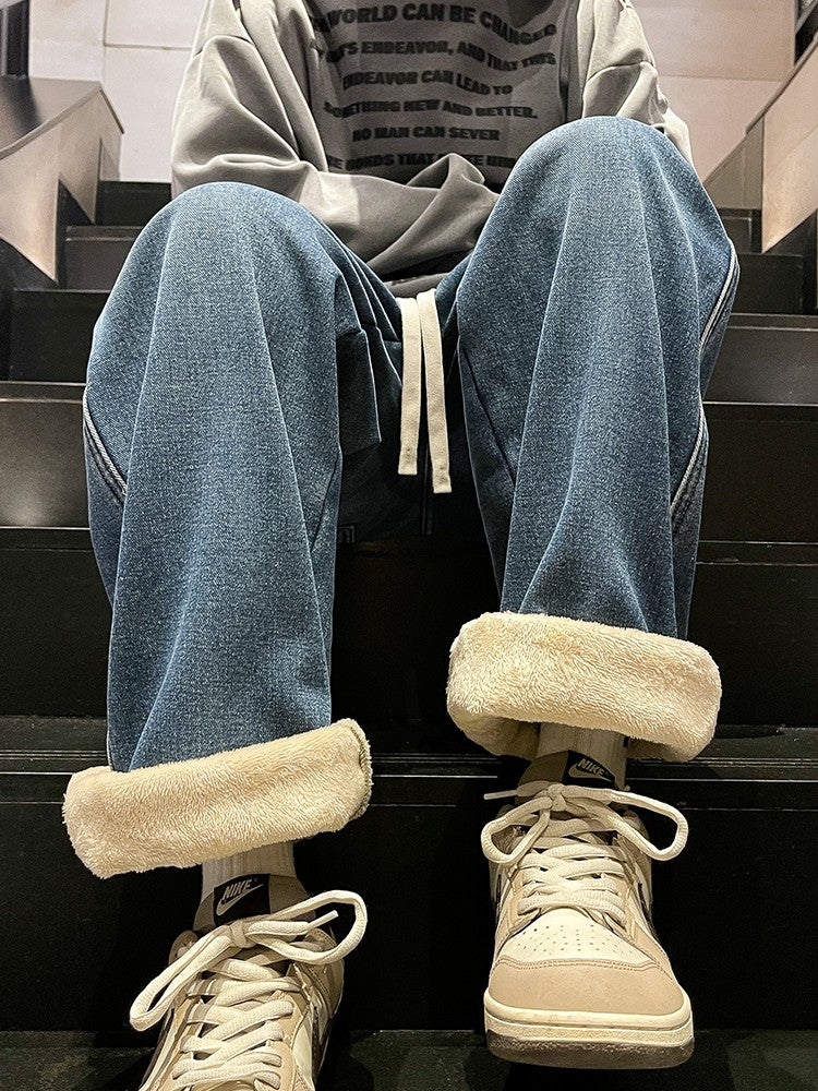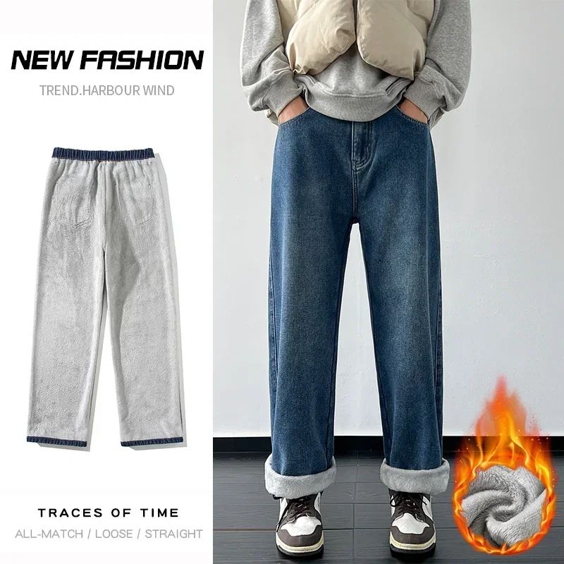 Thick Vintage Jeans Men's Winter Straight Warm Fleece Baggy Thermal Denim Trousers Fashion Korean Wide Male Plush Pants