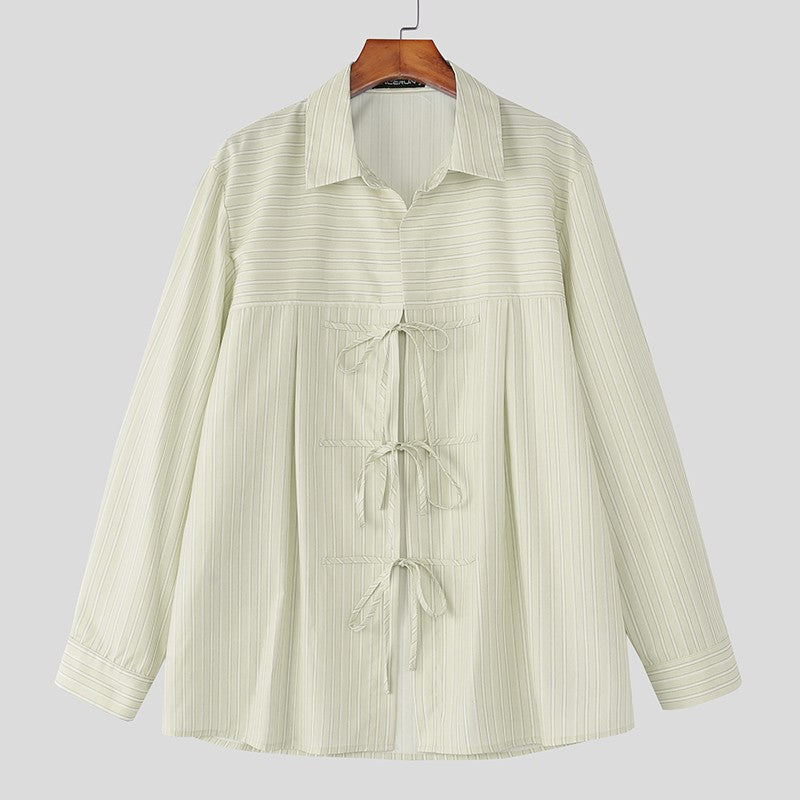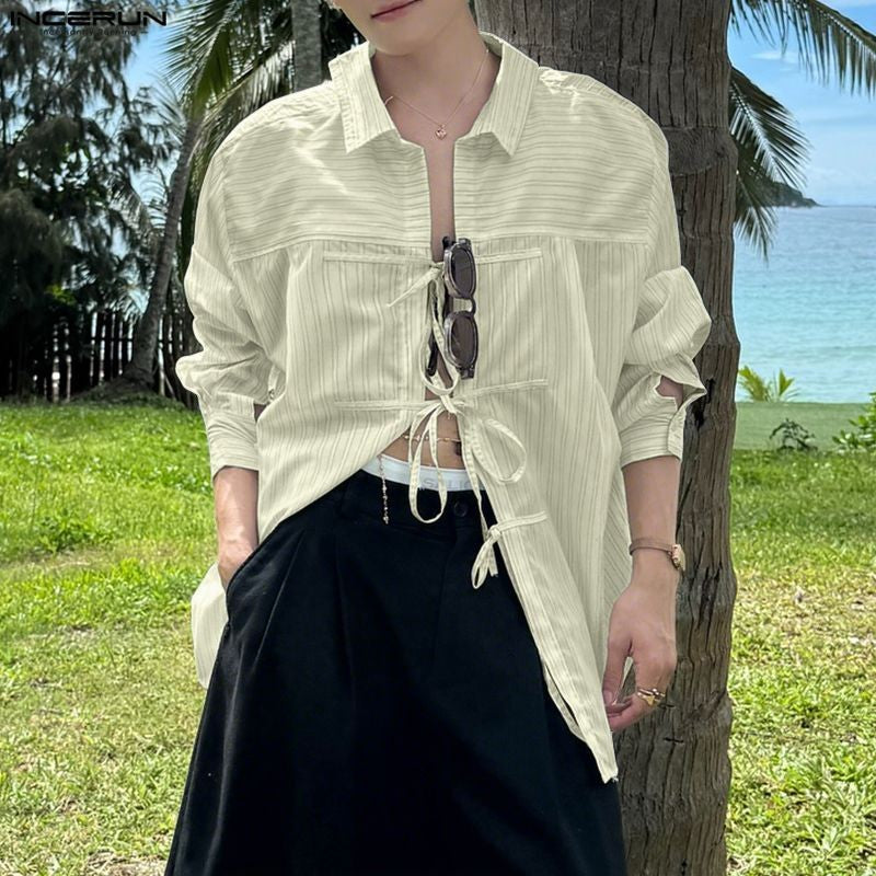 INCERUN Men Striped Shirt Lapel Long Sleeve Lace Up Hollow Out Men Clothing Oversize Korean Style Streetwear Casual Shirts Men