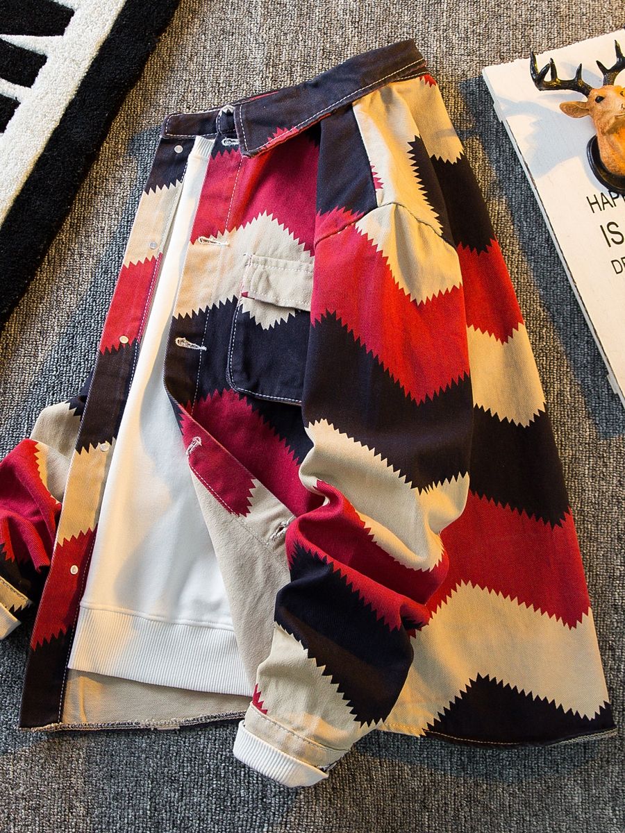 American Retro Diamond Denim Shirt Men Clothing Autumn Polo Neck Trendy High Strret Loose Casual Blouses Cargo Jacket for Men