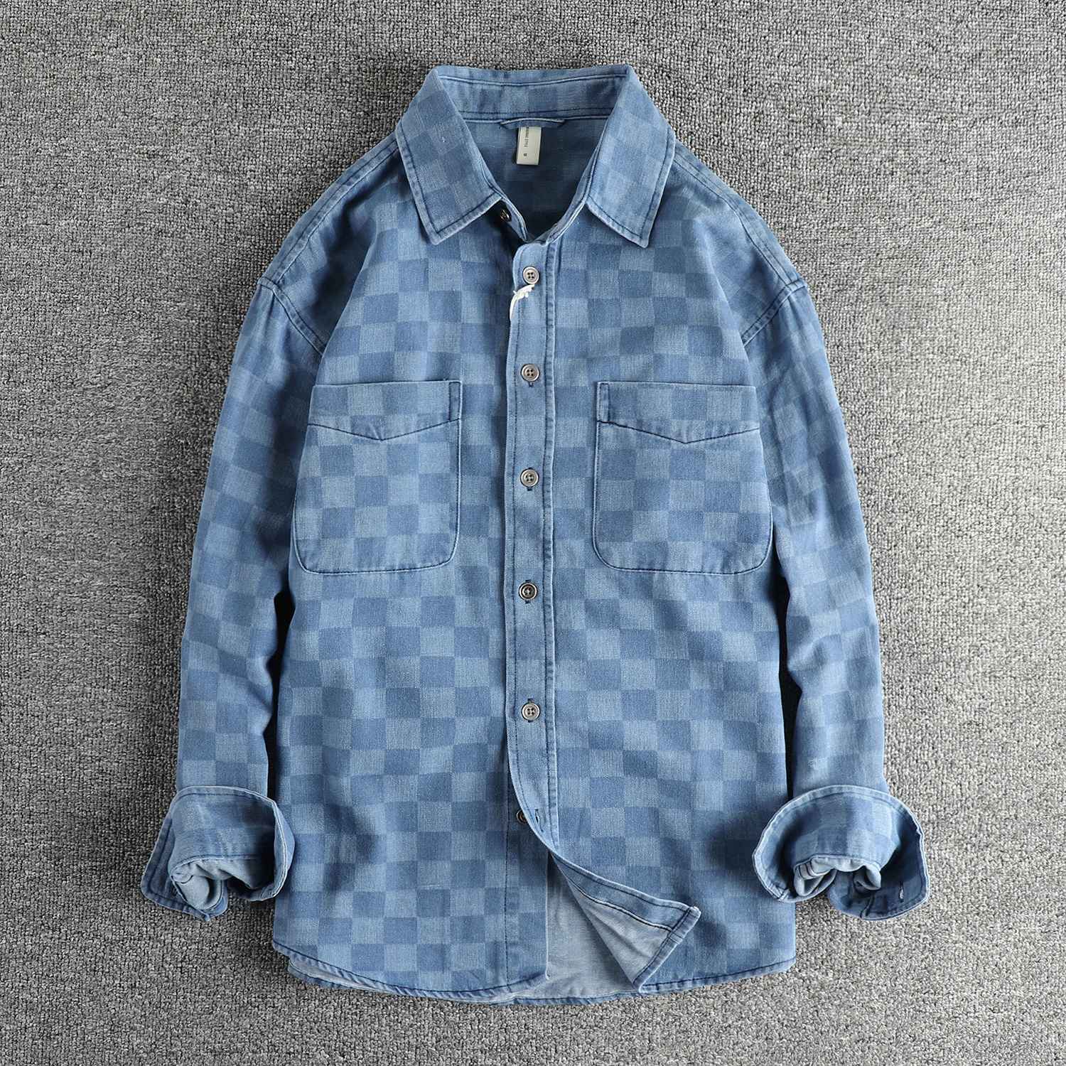 Spring Japanese Retro Long Sleeve Lapel Denim Plaid Cargo Shirts Men's High Street 100% Cotton Washed Loose Casual Thin Jacket