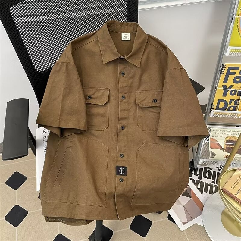 Summer Short-sleeved Shirt Men Women Pure Color Lapel Multi-pocket Cargo T-shirt Japanese Vintage Loose Casual Shirt Unisex New