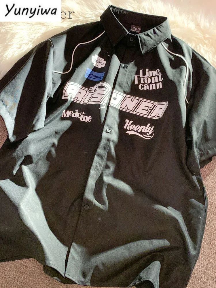 Cargo Short-sleeved Shirt New Summer Youth Casual Lapel Button Up Blouse Men Women Hip Hop Letter Print Racing Tee