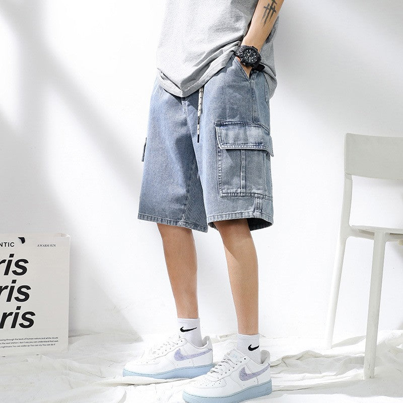 Denim shorts men's 2025 summer new light colored personalized hanging rope loose casual denim five quarter pants men's pants