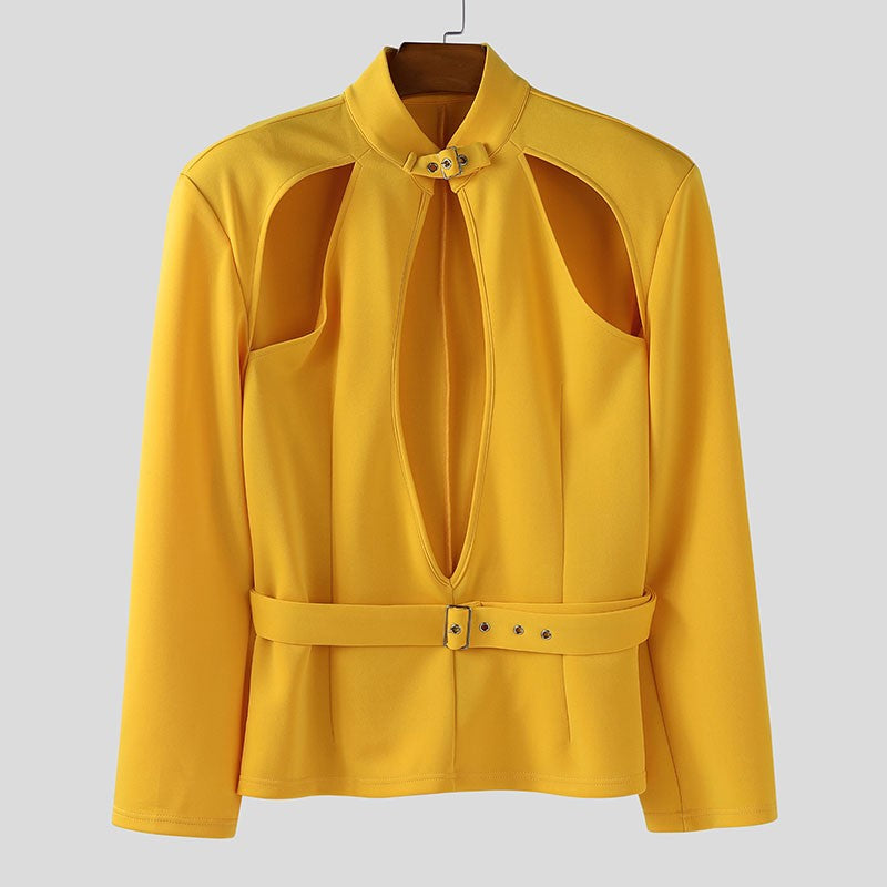 INCERUN Men Blazer Solid Stand Collar Long Sleeve Hollow Out Male Suit Streetwear Personality Fashion Casual Blazer With Belt