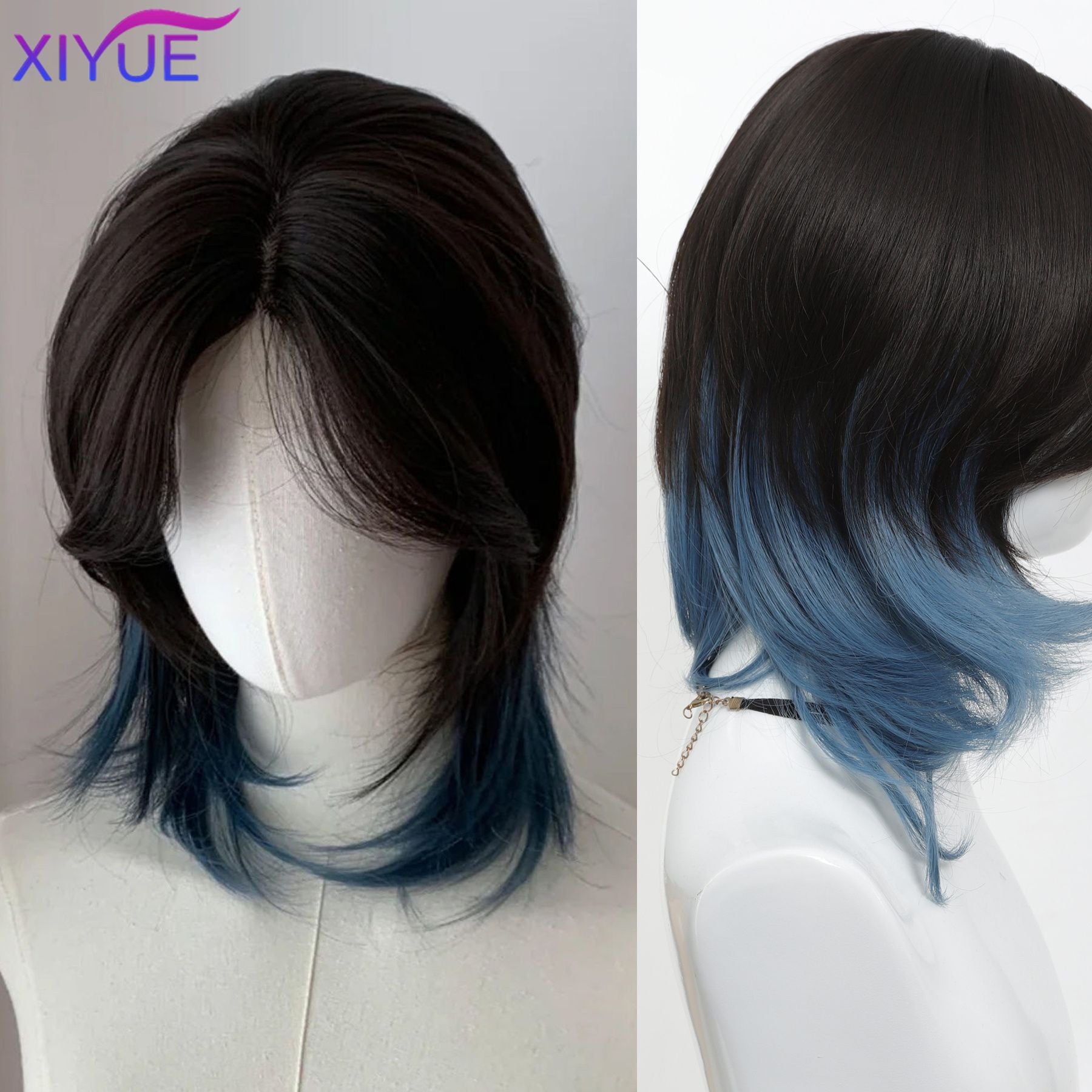 XIYUE synthetic Black And blue Mullet Head Wig Synthetic Straight Fluffy Natural Wolf Tail Hair for Daily Use Party Cosplay