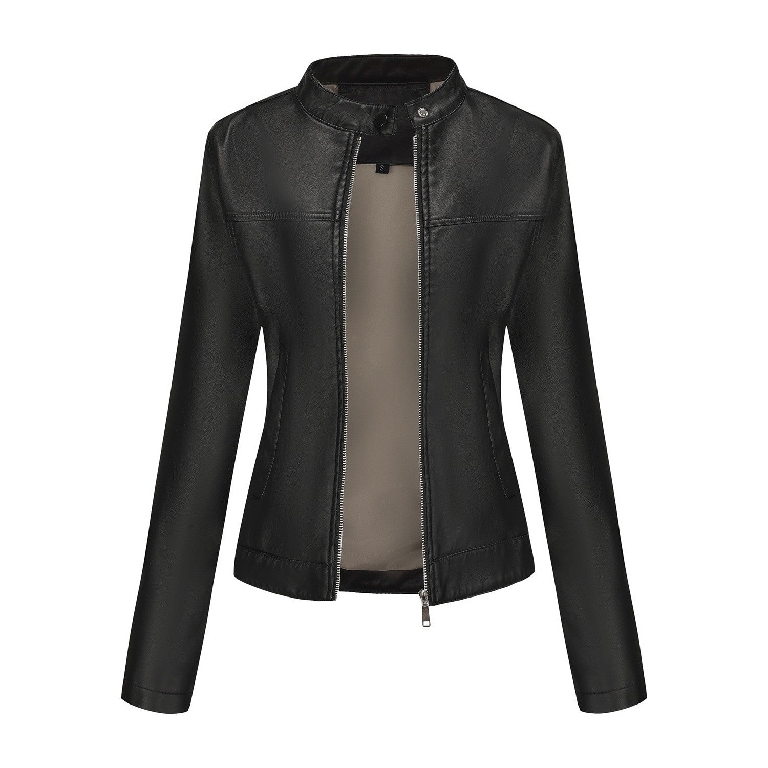 Women's Slim Leather Jacket, Stand-up Collar, Zipper Stitching, Monochromatic Coat, Fashion Clothing, New