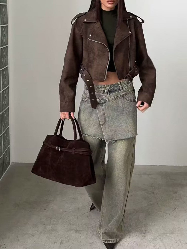 European style new women's fashion versatile temperament retro design velvet PU motorcycle jacket short coat
