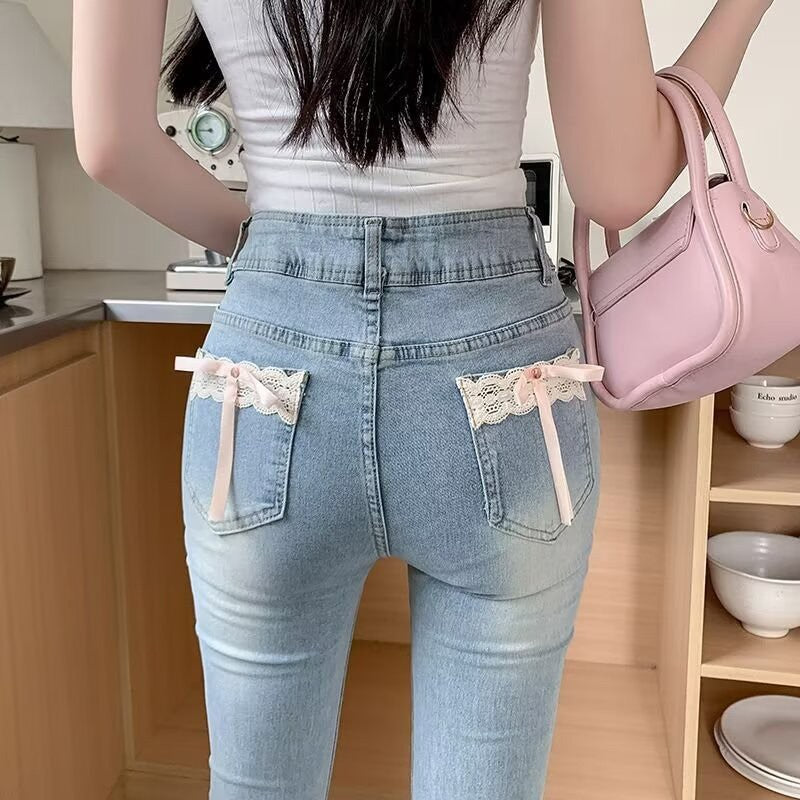 Woman Daily Vintage Blue Flare Jeans Female High Waist Stretch Bell Bottom Pants Girls Kawaii Lace Bow Decoration Denim Trousers