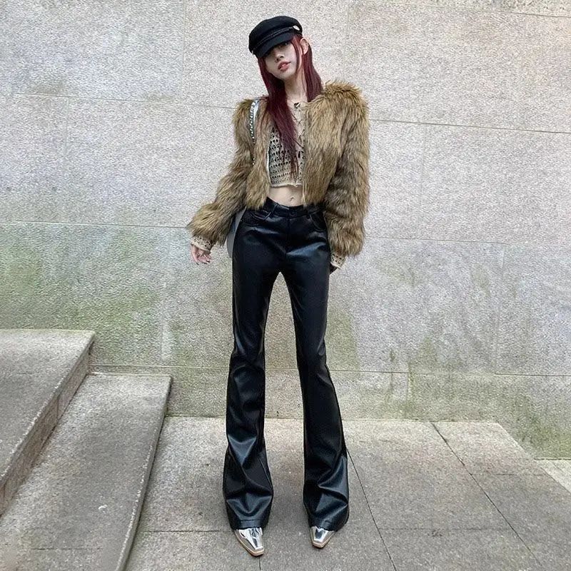 High Waist Woman Trousers Sexy Black PU Leather Flare Pants For Women Vintage Harajuku Elastic One Size Clothing Elegant Sale G